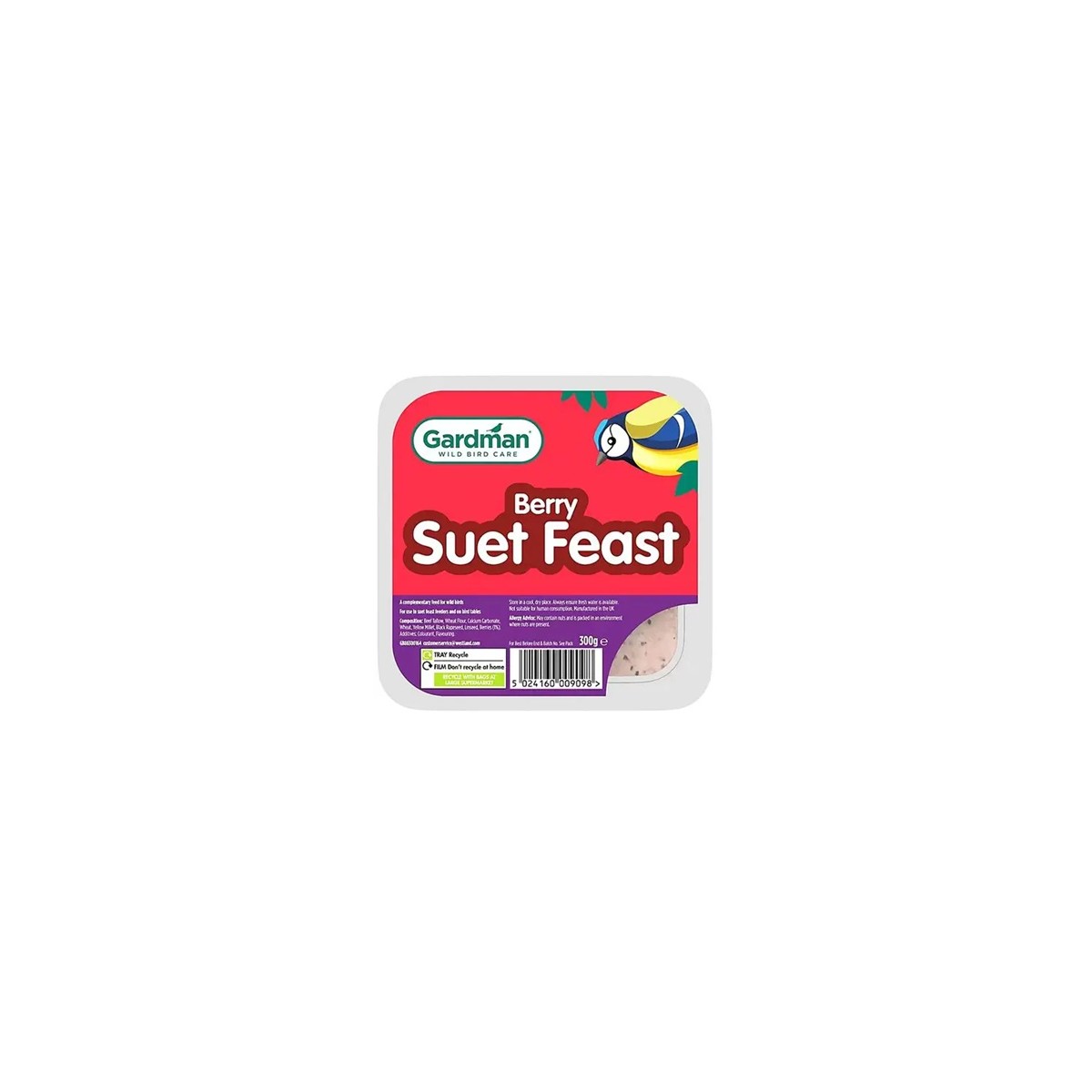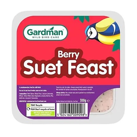 Gardman Berry Suet Feast is a high energy suet block with added berry. High energy, extra protein Recommended all year round feeding but an excellent winter food Suitable for use in suet feast feeders, on tables and ground feeders