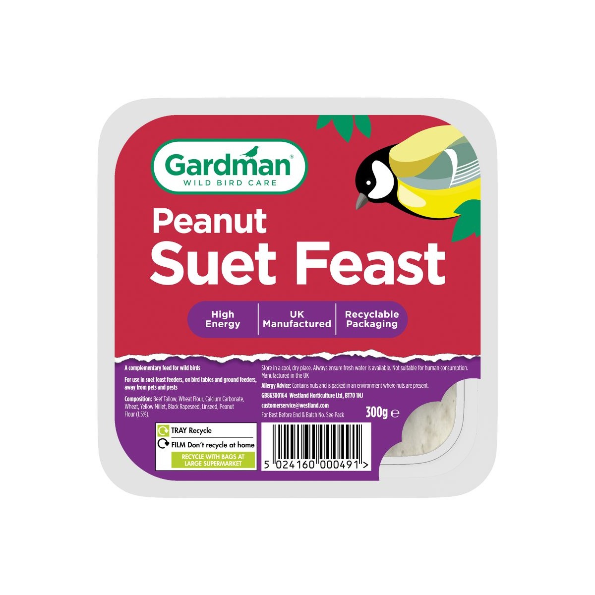 Gardman Peanut Suet Feast is a high energy suet block with added crushed peanuts High energy, extra protein Recommended all year round feeding but an excellent winter food Suitable for use in suet feast feeders, on tables and ground feeders