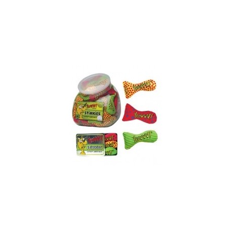 Stinkies cat toy filled with nothing but 100% organically grown American catnip inside. Made from heavy duty cotton and coloured using only natural vegetable or soy based colours. Available in three different designs, provided at random.
