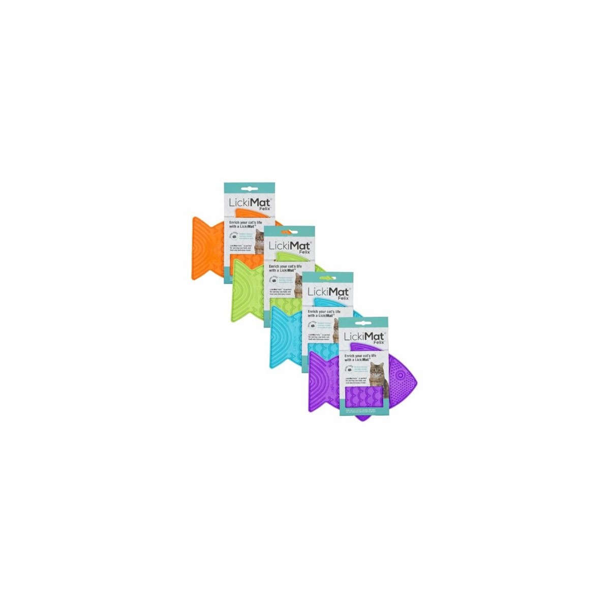 MIMICS CAT'S PREDATORY FEEDING LickiMat Casper and Felix enrich feeding time for cats by allowing greater activity, like they would experience in the wild. LickiMat Casper and Felix stop "whisker stress" and allow your cat to feed in a crouching position with a full view of their surrounds, reducing stress and anxiety. The pockets are designed to promote licking action to extract food and slow down eating and make meals or treats last a long time.REDUCES ANXIETY, BOREDOM AND DESTRUCTIVE BEHAVIOUR LickiMat helps calm and soothe your cat as they enjoy their favourite treat by helping release endorphins through the promotion of licking. Great for when you leave home, great for stressful times such vet visits, injections, injury recovery as well as thunderstorms and fireworks. Please remember to supervise your pet when first introducing them to LickiMat.RECOMMENDED FOR BOTH DOGS & CATS the LickiMat textured patterns are designed to please the tongues of cats and to work with all manner of treats and foods, ranging from spreadable treats, yogurt and cream cheese to raw, wet, dry and liquid foods. The licking action enhances the sense of taste, allowing your cat to enjoy just a small amount of food. LickiMats are also perfect for adding supplements and medications to treats.PROMOTES LICKING the LickiMat surfaces promote pleasurable licking for cats. The licking action generates saliva that helps protect your cats teeth and gums, and can aid digestion as saliva contains enzymes such as Amylase. The natural rubber surface also scrapes food particles and odour causing bacteria off your cats tongue, promoting fresher breath.SERVE HEALTHY TREATS the LickiMat allows you to serve a wide variety of treats: sardines, yogurt, purees, spreads and all manner of organic and healthy pet approved treats. The magic of LickiMat is that challenging your cat to lick the treat out of the patterned surface in order to be rewarded by the treat, slows the process dramatically and prolongs their enjoyment. Less calories, healthier treats and longer duration.SLOWER FEEDING & HEALTHIER FEEDING the LickiMat can be used to promote slower eating, which in turn reduces bloating and improves digestion. A great alternative to slow feed bowls. You can even freeze food and treats on the mat for slower and more enjoyable feeding.ALTERNATIVE TO FEEDING BOWL the LickiMat is a perfect replacement for all cat bowls and there are a wide variety of designs and colours to suit your preferences. You can serve raw, wet, dry and liquid food at the same time without making a mess.For fun pet interaction, two designs are available. Lickimat Casper, with its complex and deeper pocket design, is perfect for presenting both dry and wet cat food along with soft and liquid treats like yogurt, purees, gravy or liquid treats and foods.Made from non-toxic food grade TPRSuitable for all cats (and dogs - supervise pet for first few times until sure they will not chew mat)Microwave and freezer safeHand washableWhisker FriendlyAuthentic LickiMat Boredom Buster for CatsPerfect for Raw Food, Wet Food, Treats, Yogurt, Spreads, Liquid Food, Pet FoodSlow Feeder, Healthy and Fun Alternative to a Cat Feed BowlAvailable in a Variety of Colours.