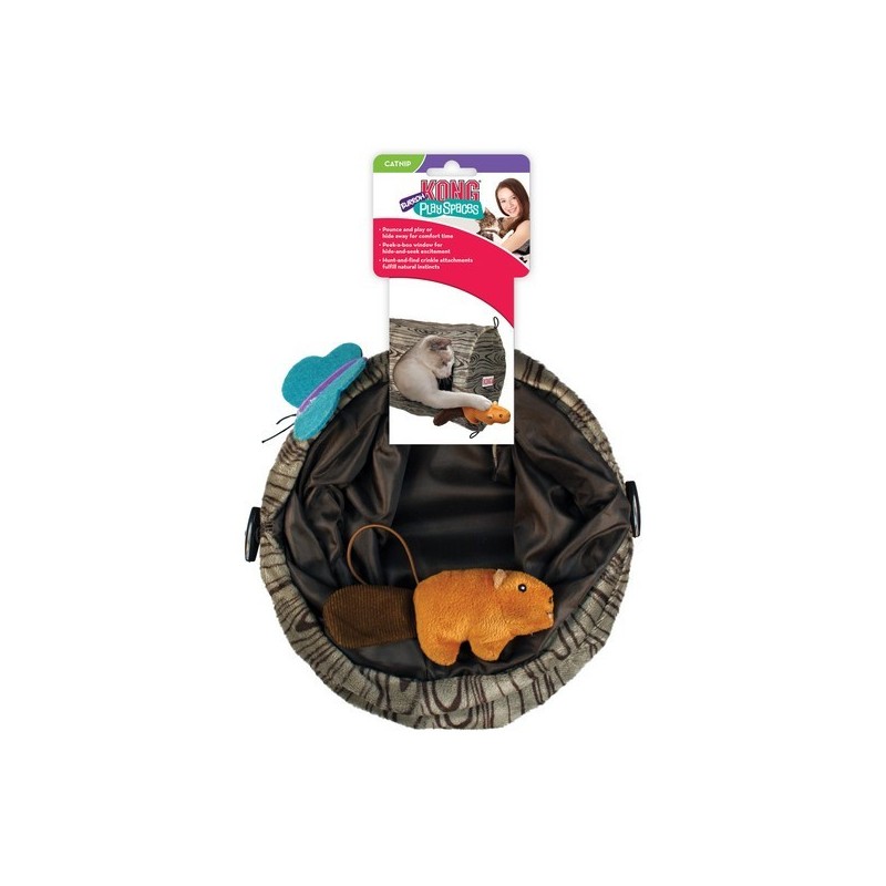 KONG Burrow offers pounce and play options for feisty felines or an enclosed hideout for kitties that prefer comfort time. The crinkle tunnel and peek-a-boo windows ignite hide-and-seek excitement while the hunt and find catnip packed beaver and butterfly attachments fulfill natural hunting instincts.