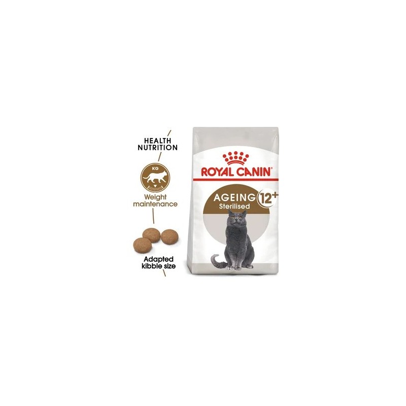 Your sterilised cat requires a complete and balanced diet to support optimal health throughout its senior years. ROYAL CANIN® Ageing Sterilised 12+ is specifically formulated with the nutritional needs of your sterilised, senior cat in mind. It is often the case that the activity levels of some senior cats reduce with age this is particularly true for sterilised cats like yours. This can sometimes lead to unwanted or excessive weight gain. ROYAL CANIN® Ageing Sterilised 12+ contains a moderate level of fat to help maintain your cats ideal body condition. Our healthy ageing complex contains a patented composition of antioxidants, including lycopene and Omega-3 fatty acids to help support the health of your cats bodily functions throughout the ageing process. The Omega-3 fatty acids in ROYAL CANIN® Ageing Sterilised 12+ help to support and maintain healthy joints and bones. Whats more, thanks to an adapted level of phosphorus, ROYAL CANIN® Ageing Sterilised 12+ also helps to support your senior cats renal health by assisting in the maintenance of proper kidney function. Its important to support your cats urinary system. Thats why ROYAL CANIN® Ageing Sterilised 12+ contains specific nutrients to help maintain a healthy urinary system. To cater to each cats individual preferences, ROYAL CANIN® Ageing 12+ is also available as wet food in either a delicious gravy or jelly. There is also an alternative dry version available for non-sterilised cats. If youre considering mixed feeding, simply follow our feeding guidelines to ensure your cat gets an accurate amount of both wet and dry food for optimal benefit. At ROYAL CANIN® were committed to providing nutritional solutions to your pets needs. All of our products undergo an extensive quality control process in order to guarantee the optimum quality of food as well as catering to your cats specific dietary requirements and lifestyle. This means that when your cat eats ROYAL CANIN® Ageing Sterilised 12+, its getting a complete and balanced diet.