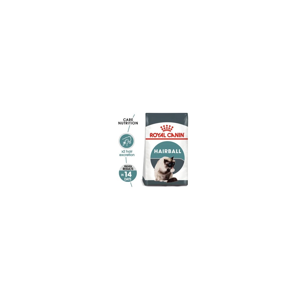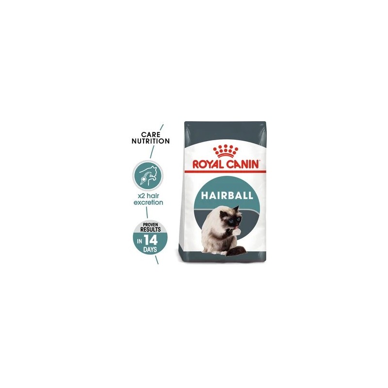 Cats often spend large parts of its day self-grooming and can therefore swallow large quantities of hair. This ingested hair can become compacted in the digestive tract, resulting in the formation of hairballs which are then either regurgitated or eliminated through its faeces. Hairballs can cause discomfort and soreness through stomach aches and regurgitation, as well as digestive health problems including the loss of nutrition through regurgitated hairballs. ROYAL CANIN® Hairball Care is composed of a specific blend of dietary fibres, including psyllium (rich in mucilage) and insoluble fibres to help naturally stimulate a healthy intestinal transit. As a result, hair swallowed daily can be eliminated in its faeces rather than building up in the stomach and being regurgitated. ROYAL CANIN® Hairball Care contains a precise combination of nutrients with a high protein content and a high fat content to ensure that a healthy level of nutrients is maintained effectively. This product is also formulated with an accurate balance of minerals to help maintain the health of your adult cats urinary system. ROYAL CANIN® Hairball Care has been proven to eliminate twice as much excess hair in a cats body after just 14 days of feeding. To cater to each cats individual preferences, ROYAL CANIN® Hairball Care is also available as wet food in delicious gravy. If youre considering mixed feeding, simply follow our feeding guidelines to ensure your cat gets an accurate amount of both wet and dry food for optimal benefit. At ROYAL CANIN® were committed to providing nutritional solutions to your pets needs. All of our products undergo an extensive quality control process in order to guarantee the optimum quality of food as well as catering to your cats specific dietary requirements and lifestyle. This means that when your cat eats ROYAL CANIN® Hairball Care, its getting a complete and balanced diet.