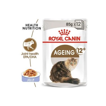 As your cat enters its senior years, its body particularly its joints will need even more support through nutrition to help maintain overall health. However, along with the changes in the type of nutrition your cat will require, the type of food it instinctively prefers will also change. To ensure that your senior cat (aged 12+) receives the specific nutrition it needs to help maintain optimal health, you will also need to feed it a diet that it will consume naturally and preferentially. Essentially, the right nutrition will only be able to support optimal health if it is within a food that is precisely crafted for regular and instinctive consumption. Thats why ROYAL CANIN® Ageing 12+ in Jelly is formulated to match the optimal Macro Nutritional Profile that is instinctively preferred by ageing cats like yours. The joint health of senior cats is paramount to their ability to partake in physical activity and maintain good overall health which is why they typically need higher levels of nutritional support. ROYAL CANIN® Ageing 12+ in Jelly provides senior cats with specially formulated food to help maintain healthy joints through a high level of Omega-3 fatty acids specifically EPA and DHA. ROYAL CANIN® Ageing 12+ in Jelly also contains an adapted phosphorus content to help support healthy kidney function and overall renal health. To cater to each cats individual preferences, ROYAL CANIN® Ageing 12+ is also available in a delicious gravy, or as dry food with tasty and crunchy kibble. If youre considering mixed feeding, simply follow our feeding guidelines to ensure your cat gets an accurate amount of both wet and dry food for optimal benefit. At ROYAL CANIN® were committed to providing nutritional solutions to your pets needs. All of our products undergo an extensive quality control process in order to guarantee the optimum quality of food as well as catering to your cats specific dietary requirements and lifestyle. This means that when your cat eats ROYAL CANIN® Ageing 12+ in Jelly, its getting a complete and balanced diet.