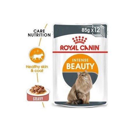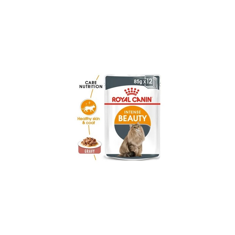 Maintaining your cats coat can be challenging, particularly in long-haired breeds, but providing your cat with the right nutrients will greatly contribute to a healthy, shiny coat that truly shows off its natural beauty. ROYAL CANIN® Intense Beauty in Gravy contains high levels of omega-3 & omega-6 fatty acids to help your cat maintain a beautiful coat and healthy skin. Hair and skin care is vital to your cats wellbeing, it surrounds its bodies externally and is a key indicator of whether its living in comfort or not as is often said, whats on the outside usually reflects what happening on the inside. With ROYAL CANIN® Intense Beauty in Gravy, you can ensure that your cats skin health, coat health and general wellbeing is never compromised. ROYAL CANIN® Intense Beauty in Gravy also helps your cat maintain an ideal weight with a low fat content to help prevent excess weight gain, and an optimal protein level for healthy muscle development and growth. A healthy urinary system is also supported by ROYAL CANIN® Intense Beauty in Gravy, it helps maintain your cats bladder function. Among the variety of nutrients, meat and fish are both included for optimal palatability as well as a host of vegetable derivatives for extra vitamin and mineral support for complete skin and fur nourishment. To cater to each cats individual preferences, ROYAL CANIN® Intense Beauty is also available as dry food, with crunchy and tasty kibble. If youre considering mixed feeding, simply follow our feeding guidelines to ensure your cat gets an accurate amount of both wet and dry food for optimal benefit. At ROYAL CANIN® were committed to providing nutritional solutions to your pets needs. All of our products undergo an extensive quality control process in order to guarantee the optimum quality of food as well as catering to your cats specific dietary requirements and lifestyle. This means that when your cat eats ROYAL CANIN® Intense Beauty in Gravy, its getting a complete and balanced diet.
