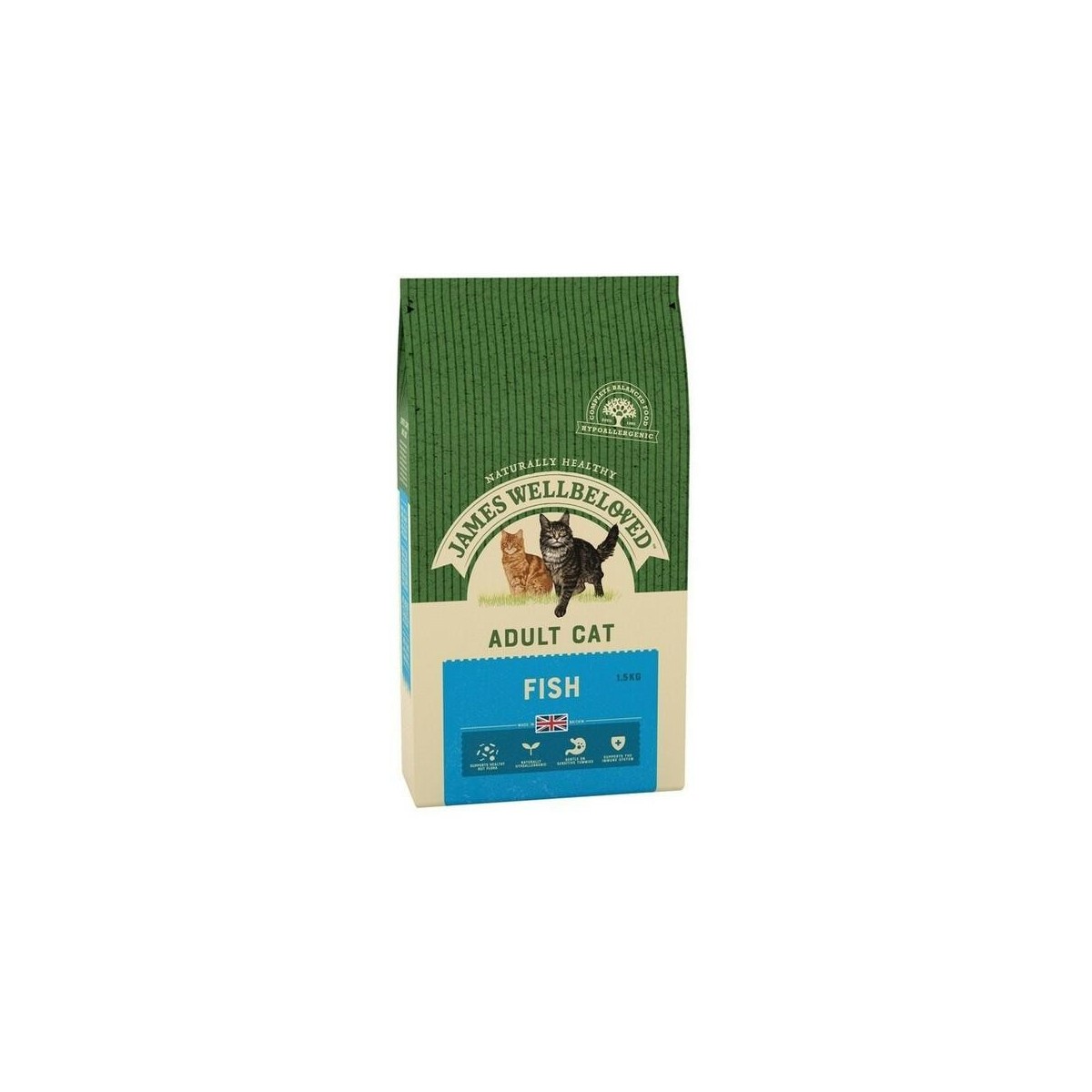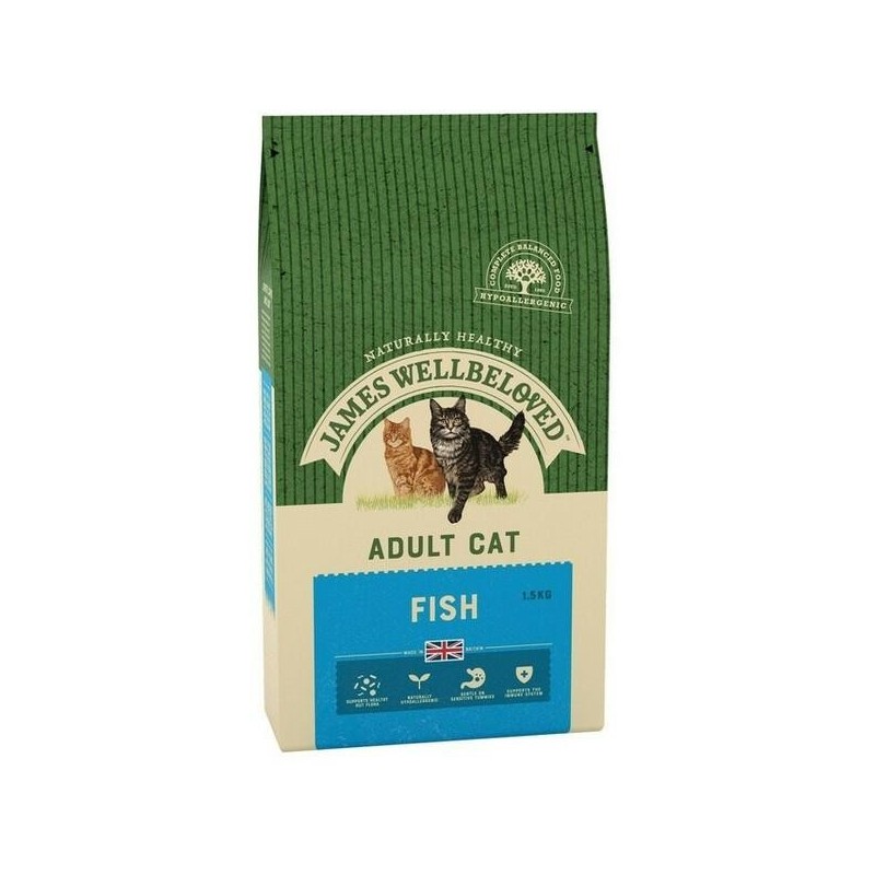 ADULT VARIETY The Adult variety is perfect for fully grown, average weight, active cats. All the nourishment required for a healthy life in peak condition. A complete and balanced food with all the vitamins and minerals your cat needs. Highly digestible and easily absorbed goodness. This produces small, firm stools and minimal litter tray waste and smell Cats love the taste of fish. Now James Wellbeloved has made a mouth watering Ocean White Fish & Rice recipe for your feline companion. Our new, exciting variant captures the freshness and bounty of one of nature's great providers - the oceans. Feed James Wellbeloved Ocean White Fish & Rice to your cat and see how healthy she looks. Even fussy cats love it. Prepare to be amazed! Natural, healthy, ingredients. No added artificial colours, flavours or preservatives. Pure and hypo-allergenic. Special Omega-3 oils for a soft, shiny coat. A natural approach to urinary tract health. The same delicious taste, right across the range. Natural, healthy, ingredients. With no added artificial colours, flavours or preservatives. Ocean White Fish & Rice cat food is a complete dry food full of natural ingredients. Succulent fish, rice, maize, tomato, carrot and potato. All baked into crunchy nuggets and smothered in delicious olive oil. With no unhealthy additives. Pure and hypo-allergenic. Cats can suffer from food allergies, producing poor skin and coat condition and stomach problems. The most common allergens are milk, beef, and wheat. So Ocean White Fish & Rice cat food contains none of these problem ingredients and thus avoids the allergies. Your cat could be fitter and healthier as a result. Special Omega-3 oils for a soft, shiny coat. A healthy diet makes for a glowing coat. As well as all the vitamins and minerals your cat needs, we've included a unique blend of Omega-3 oils to nourish and condition your cat's coat to a silky soft, glossy shine. A natural approach to urinary tract health. We've added natural cranberry extracts, known to be beneficial to urinary tract hygiene. And kept the magnesium level low to help keep your cat's urinary system in perfect health. The same delicious taste, right across the range. Ocean White Fish & Rice comes in 3 varieties: Kitten, Adult and Senior/Light. All have the same delicious taste. So you avoid the health and taste problems of changing brands at the different stages of your cat's life. Ingredients: White rice (min 26%), white fish meal (min 25%), prairie meal, olive oil, potato protein (min 9%), vegetable, fish oil,tomato, chicory extract, carrot, cranberry extract (min 0.05%), DL methionine, lysine hydrochloride, taurine, threonine, zinc methionate, yucca extract, rosemary oil. Typical analysis: Protein 31%, oil 18%, ash 7%, fibre 1.8%. Vitamins (i.u. per kg): vitamin A 25,000; vitamin D3 1500; vitamin E (alpha-tocopherol acetate) 200. Copper (cupric sulphate) 15mg per kg. Contains vitamins C and E as mixed tocopherol antioxidants.