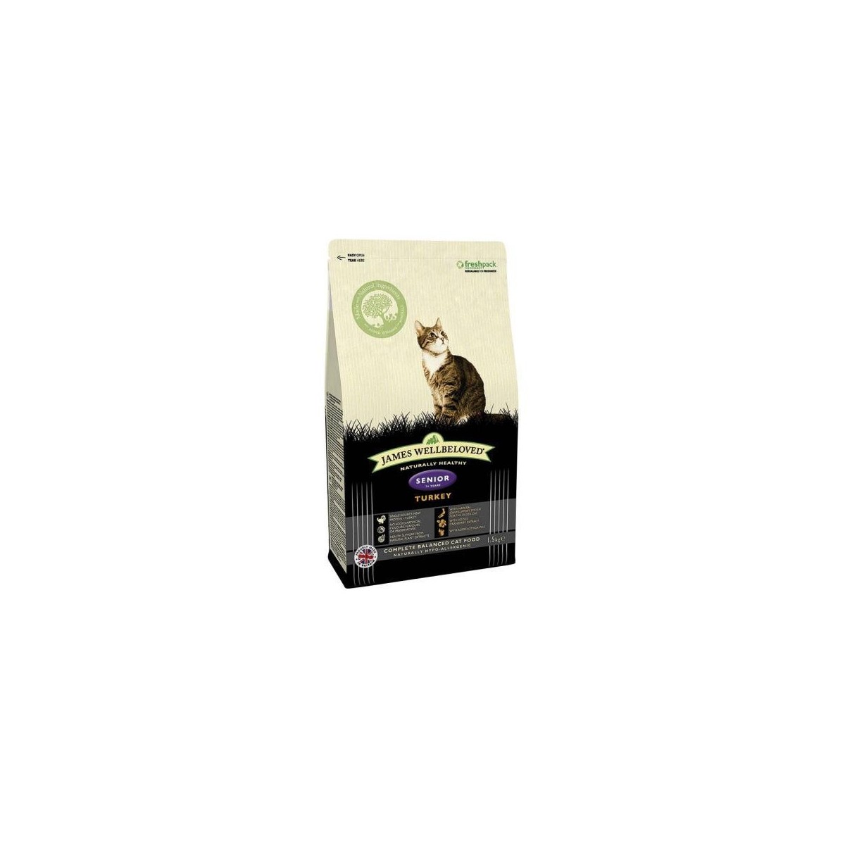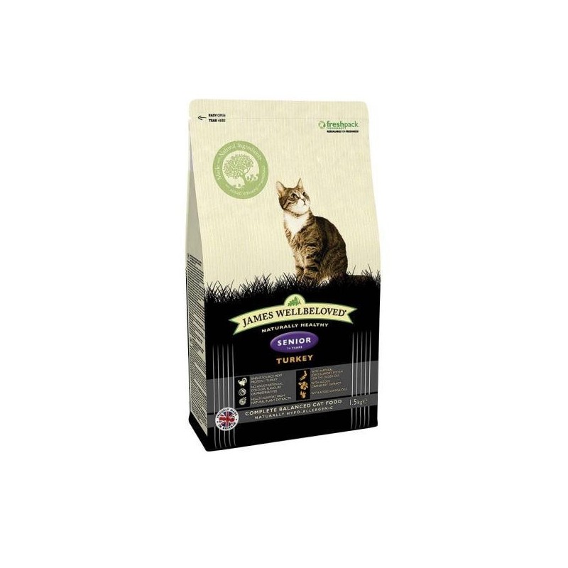 SENIOR This variety is perfect for the older or less active cat who may be overweight: Has 33% less fat and less calories, but is still delicious and satisfying. Helps your cat lose weight as part of a calorie-controlled diet. The ingredients are superb, bursting with flavour in a wholesome recipe that's hypo-allergenic with no unhealthy additives. Tasty Turkey & Rice will truly be a revelation. Your cat will adore it and carry on doing so, day after day. See for yourself. Ask your local pet shop for a free trial sample to get a free meal for your cat. Feed James Wellbeloved Turkey & Rice to your cat and see how healthy she looks. Even fussy cats love it. Prepare to be amazed! Natural, healthy, ingredients. No added artificial colours, flavours or preservatives. Pure and hypo-allergenic. Special Omega-3 oils for a soft, shiny coat. A natural approach to urinary tract health. The same delicious taste, right across the range. SENIOR/LIGHT VARIETY Ingredients: White rice (min 26%), turkey meat meal (min 26%), prairie meal, turkey fat, chicken gravy, potato protein (min 2.5%), tomato, omega-3 oil supplement (min 0.5%), chicory extract, carrot, cranberry extract (min 0.05%), DL methionine, lysine hydrochloride, taurine, threonine, zinc methionate, yucca extract, rosemary oil. Typical analysis: Protein 29%, oil 12%, ash 7%, fibre 3%. Vitamins (i.u. per kg): vitamin A 25,000; vitamin D3 1500; vitamin E (alpha-tocopherol acetate) 200. Copper (cupric sulphate) 15mg per kg. Contains vitamins C and E as mixed tocopherol antioxidants