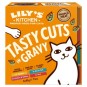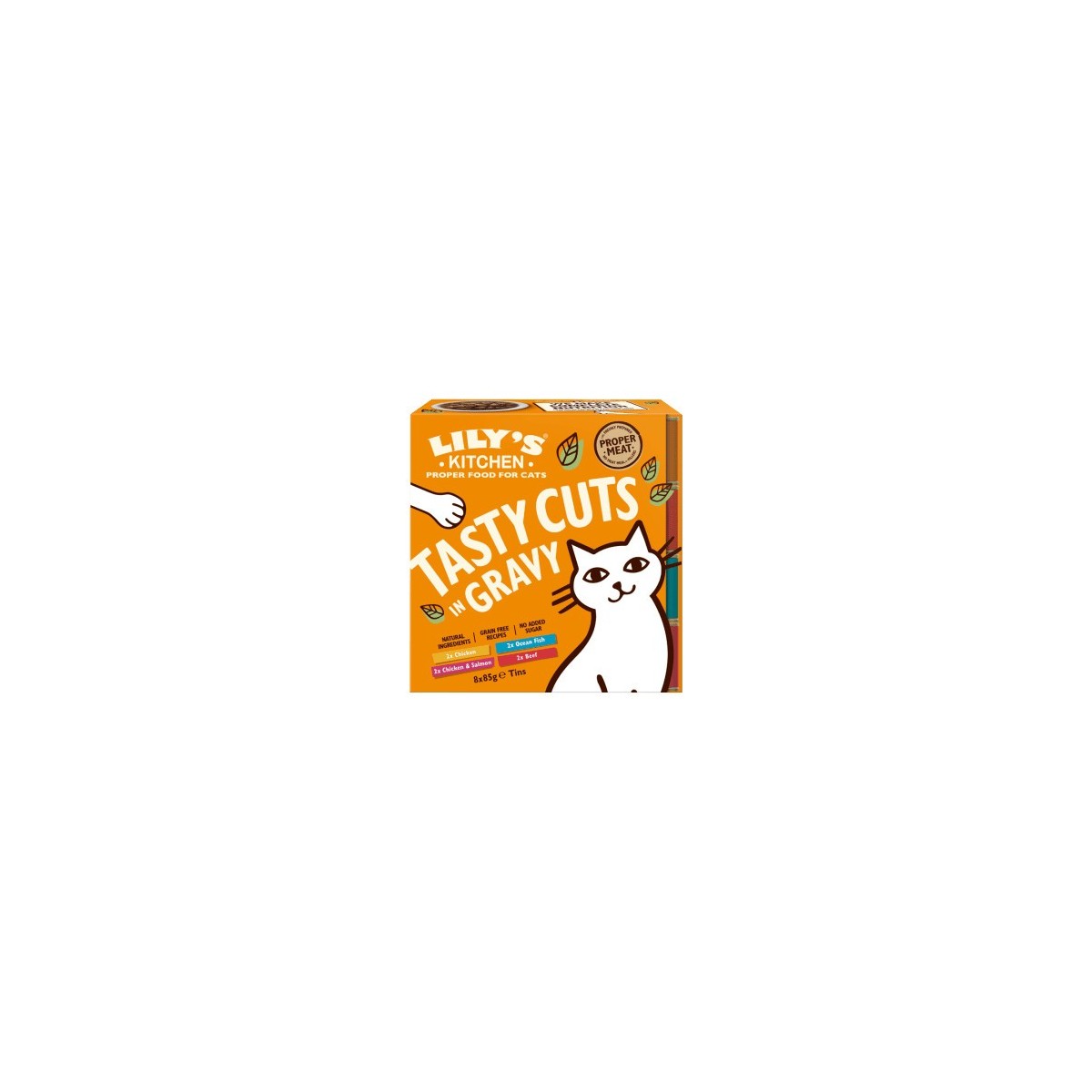Were on a mission to change the way cats eat. So weve taken the chunky texture that cats love so much, but instead, weve used proper meat and natural ingredients to create our Tasty Cuts in Gravy range. With no added sugars in sight, we present grain-free recipes that might even have your cat, dare we say it, jogging to their food bowl. And not sure about yours, but it takes a lot for our cats to exert themselves like that. Its also complete, which means this food has everything your cat needs - no not all cat food does. So cats, join us in the rebellion. Say no to rubbish food full of cheap fillers, and yes to food made with proper meat and fish. This pack includes: 2 x Tasty Cuts in Gravy Chicken (85g) 2 x Tasty Cuts in Gravy Chicken & Salmon (85g) 2 x Tasty Cuts in Gravy Ocean Fish (85g) 2 x Tasty Cuts in Gravy Beef (85g),Tasty Cuts in Gravy Chicken 53% Freshly Prepared: Chicken 40%, Pork 13%, Gravy, Minerals. Tasty Cuts in Gravy Chicken & Salmon 53% Freshly Prepared: Chicken 22%, Pork 21%, Salmon 10%, Gravy, Minerals. Tasty Cuts in Gravy Ocean Fish 53% Freshly Prepared: Fish 26% (White Fish 11%, Salmon 10%, Prawn 5%), Pork 14%, Chicken 13%, Gravy, Minerals. Tasty Cuts in Gravy Beef 53% Freshly Prepared: Beef 26%, Chicken 22%, Pork 5%, Gravy, Minerals. NOT SURE HOW MUCH TO FEED? Take these simple steps to find the perfect amount to feed your pet. FEEDING