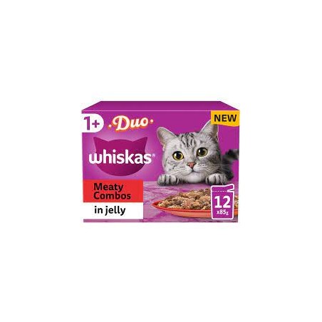 WHISKAS® Duo Meaty Combos 1+ adult cat food pouches in jelly combine two of your cats favourite flavours in one glorious meal, without compromising on nutrition. Each wet cat food pouch is crafted with two irresistible flavours for a divine taste sensation that even the fussiest of cats cannot resist! Purrs guaranteed.