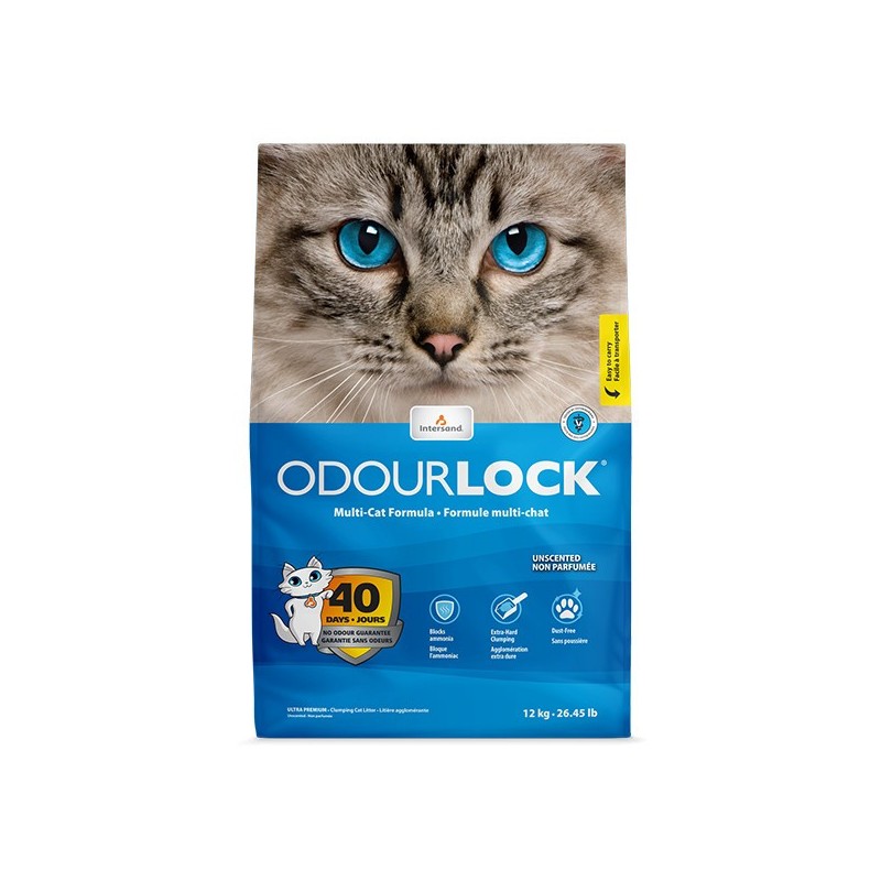 This clumping cat litter is made of all-natural clay. Its patented Smart Odor Shield technology blocks ammonia release, uniquely neutralizing urine and faeces odors for 40 days. This ultra-fast clumping and easy-scooping litter makes litter box cleaning so effortless. OdourLock generates less waste than competing clay litters: youll use 45% less litter per year. * Plus, its 99.9% dust-free, leaving no tracking on floors or furniture and keeping your cats and your familys respiratory systems safe. It is soft and comfortable for your cat. It is easily carried thanks to its side handle and is manufactured in Quebec.