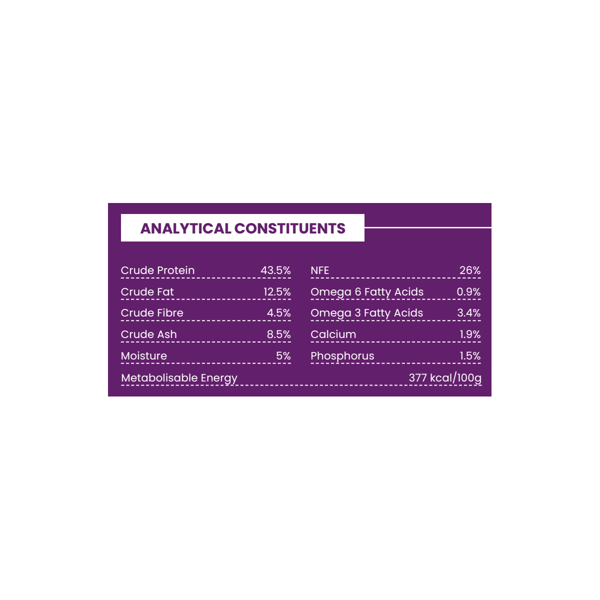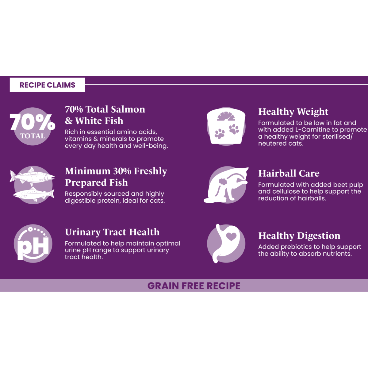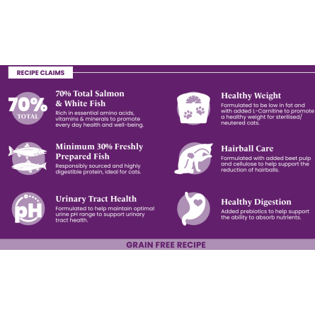 70% Fish (Including 26% Freshly Prepared Deboned Salmon, 16% Dried Salmon, 14% Dried Pollock, 7% Dried Herring, 4% Freshly Prepared White Fish, 3% Salmon Oil), Potato, Peas, Lentils, Chickpea, Cellulose (3%), Beet Pulp (3%), Hydrolysed Liver Gravy, Minerals, Fructooligosaccharides (FOS, 460 mg/kg), Glucosamine (175 mg/kg), Methylsulfonylmethane (175 mg/kg), Chondroitin Sulphate (125 mg/kg), Mannanoligosaccharides (MOS, 120 mg/kg), Dried Cranberry, Yucca Extract (190 mg/kg)