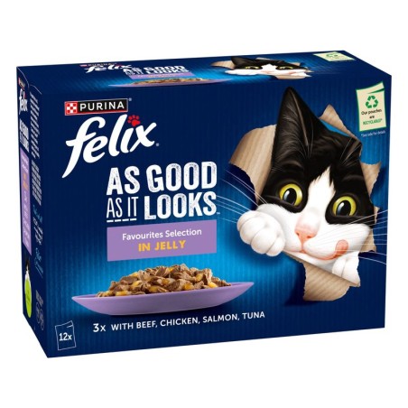 Felix "As Good As It Looks" with tender meat chunks in jelly has three chief advantages: it looks as if it were home made, smells appetizing and tastes unbelievably good. An irresistible flavour experience for any little feline. Felix contains everything your little Felix needs to stay healthy and active. Only the best quality-controlled ingredients have been used in the production of Felix As Good As It Looks.