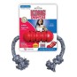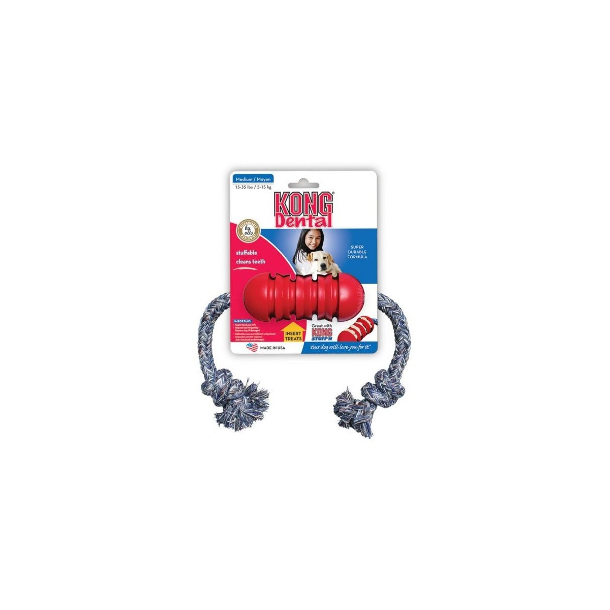 The KONG Dental with Rope toy is designed to support a dog's instinctual need to chew while having the added benefit of cleaning teeth. Made out of KONG Classic's unique all-natural red rubber formula, the KONG Dental Rope's unique grooves give dogs an appropriate chewing outlet while the all-natural rope have the added benefit of cleaning gums and polishing teeth while your dog is delighted with the complete chewing experience. Want to extend your dog's chew time? Want to extend your dog's chew time? Stuff with KONG Snacks and entice with a dollop of KONG Easy Treat. Proudly made in the USA