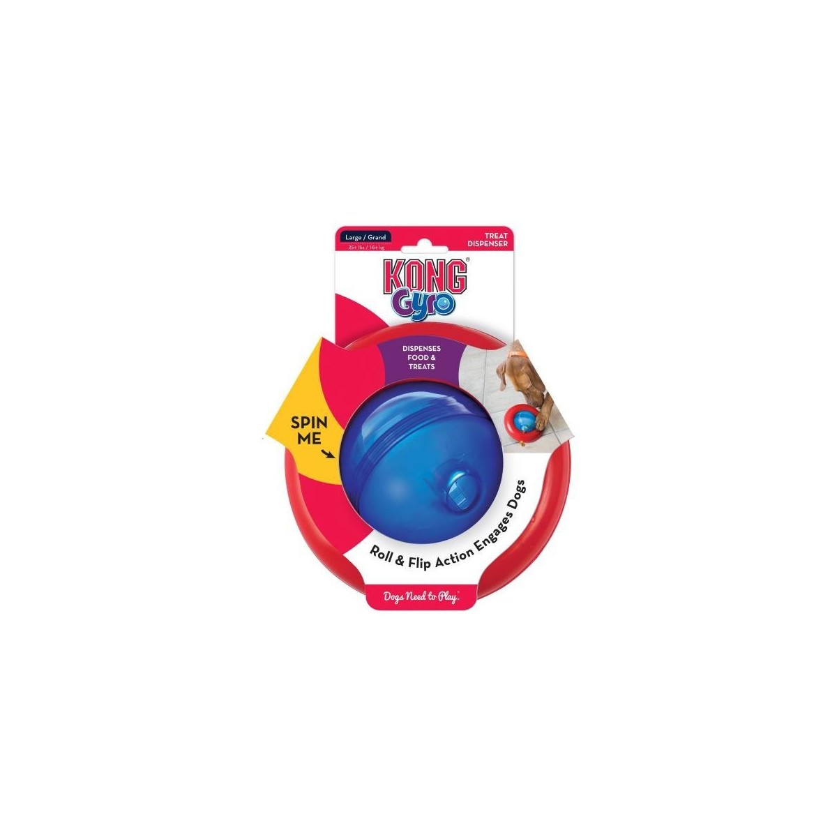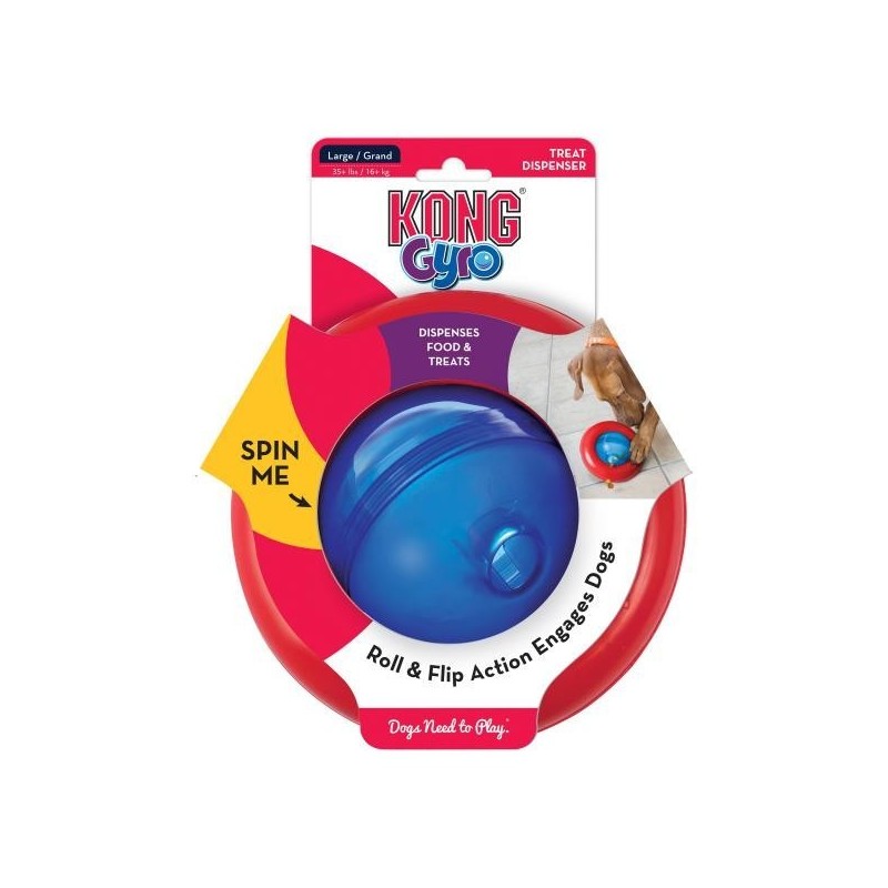 The KONG Gyro is sure to entertain with irresistible roll and flip action keeping dogs enticed and intrigued. With the center spinning orb and static outer ring, this dynamic toy encourages dogs to push, paw and roll the GYRO, delightfully dispensing tasty treat rewards along the way. Ideal for independent play, stuff with snacks or kibble for added fun and extended playtime. Available in large and small sizes.