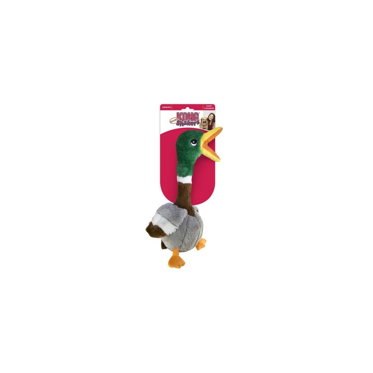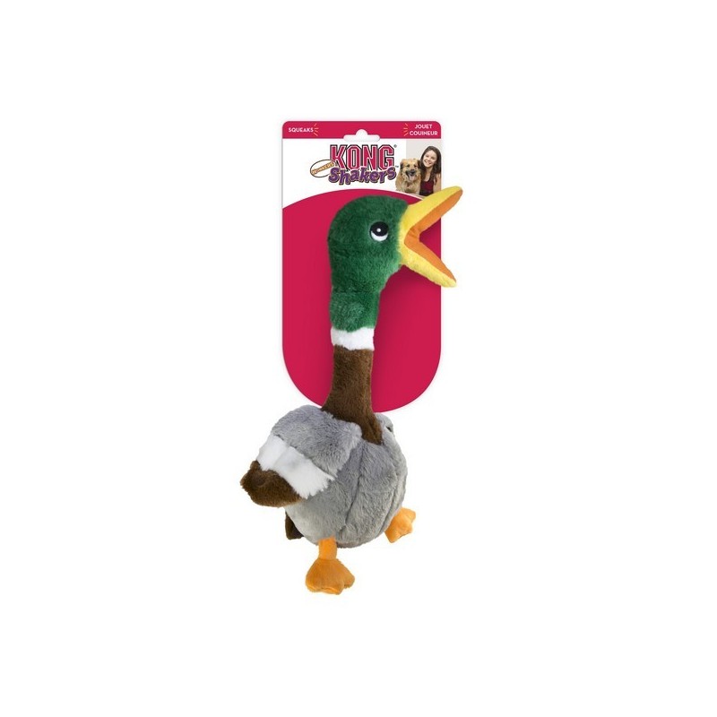 KONG Shakers Honkers Duck lets the fun fly with an internal neck which features a texture that satisfies a dogs natural chewing instincts while the long floppy legs spark shaking and tugging play sessions. KONG Shakers Honkers low tone squawk and the reinforced plush design keeps dogs tickled pink and playing longer.