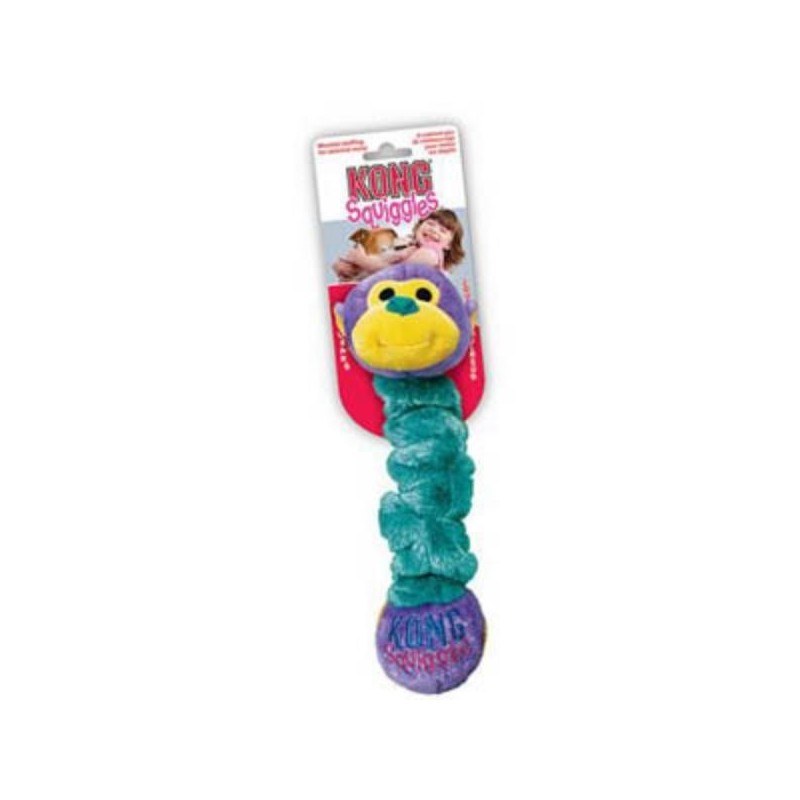 The KONG Squiggles are stretchy, floppy, squeaky fun for dogs. These colorful toys come in an assortment of four cute characters and feature a long, stretchy body - plus squeakers at both ends. Designed with minimal stuffing for less mess, your dog can shake and flap our Squiggles for lots of fun.
