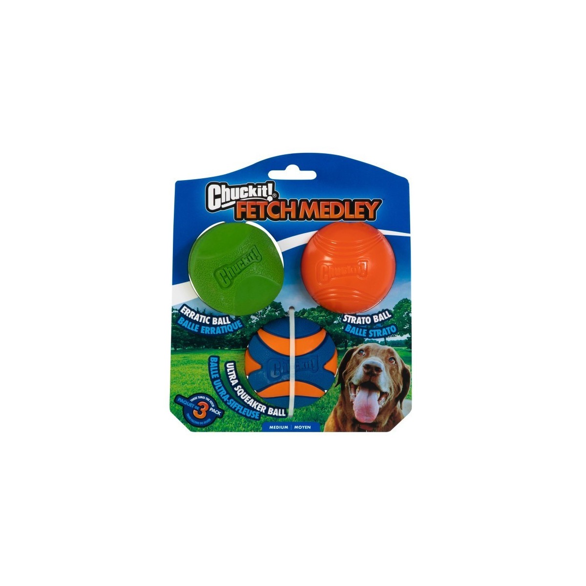 The Chuckit!® Fetch Medley 2 is a triple pack of Chuckit! Fetch Balls. The Medley pack includes a Chuckit! Strato Ball, Erratic Ball and an Ultra Squeaker Ball, our classic rubber ball with a squeak!