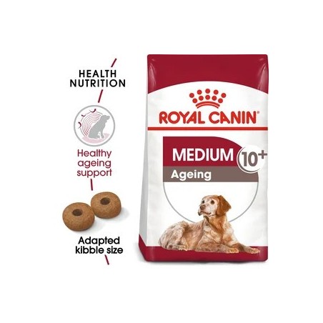 Now that your medium dog has reached its senior years, its important to make sure that its diet provides nutrients that help to support optimal health. Suitable for medium dogs aged 10+ that weigh between 11-25kg, ROYAL CANIN® Medium Ageing 10+ is specially formulated with all the nutritional needs of your medium-sized senior dog in mind. ROYAL CANIN® Medium Ageing 10+ has been specifically developed to support healthy ageing in medium breed dogs like yours. ROYAL CANIN® Medium Ageing 10+ contains a complex of antioxidants to help neutralise free radicals. This will assist in maintaining the condition of vital molecules in your dogs body to help support overall good health. ROYAL CANIN® Medium Ageing 10+ also contains EPA and DHA; Omega-3 fatty acids that help to support good bone and joint health. This is particularly important for dogs entering the senior stage of their life cycle to help maintain a great quality of life. Additionally, ROYAL CANIN® Medium Ageing 10+ has been formulated with specific nutrients to help support healthy skin and a shiny coat; which also contributes to the maintenance of overall good health. Skin health has a direct impact on the condition and appearance of a dogs coat, which is why maintaining skin health is doubly important for dogs. To cater to each dogs individual preferences, ROYAL CANIN® Medium Ageing 10+ is also available as wet food in delicious gravy. If youre considering mixed feeding, simply follow our feeding guidelines to ensure your dog gets an accurate amount of both wet and dry food for optimal benefit. At ROYAL CANIN® were committed to providing nutritional solutions to your pets needs. All of our products undergo an extensive quality control process in order to guarantee the optimum quality of food as well as catering to your dogs specific dietary requirements and lifestyle. This means that when your dog eats ROYAL CANIN® Medium Ageing 10+, its getting a complete and balanced diet.