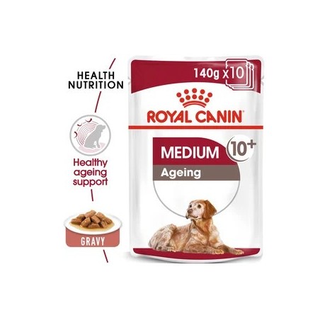 Now that your medium sized dog is starting to face the first signs of ageing, it is important that its diet contains the nutrients it needs in order to help support optimal health during this stage of its life. Suitable for medium sized dogs over 10 years old that weigh between 11-25 kg, ROYAL CANIN® Medium Ageing 10+ in Gravy is specially formulated with all the nutritional needs of dogs like yours in mind. ROYAL CANIN® Medium Ageing 10+ in Gravy contains an exclusive complex of antioxidants; these antioxidants help to neutralise the effects of free radicals to support optimal health during your dogs senior years. EPA and DHA are Omega-3 fatty acids that are included in ROYAL CANIN® Medium Ageing 10+ in Gravy to help maintain healthy joints and bones in medium breed dogs like yours that are ageing. Whats more, ROYAL CANIN® Medium Ageing 10+ in Gravy is formulated with specific nutrients that help to maintain a shiny coat and healthy skin. As your dog ages, it is important to continue supporting its skin and coat health to ensure it remains in the best possible condition. To cater to each dogs individual preferences, ROYAL CANIN® Medium Ageing 10+ is also available as dry food, with crunchy and tasty kibble. If youre considering mixed feeding, simply follow our feeding guidelines to ensure your dog gets an accurate amount of both wet and dry food for optimal benefit. At ROYAL CANIN® were committed to providing nutritional solutions to your pets needs. All of our products undergo an extensive quality control process in order to guarantee the optimum quality of food as well as catering to your dogs specific dietary requirements and lifestyle. This means that when your dog eats ROYAL CANIN® Medium Ageing 10+ in Gravy, its getting a complete and balanced diet.