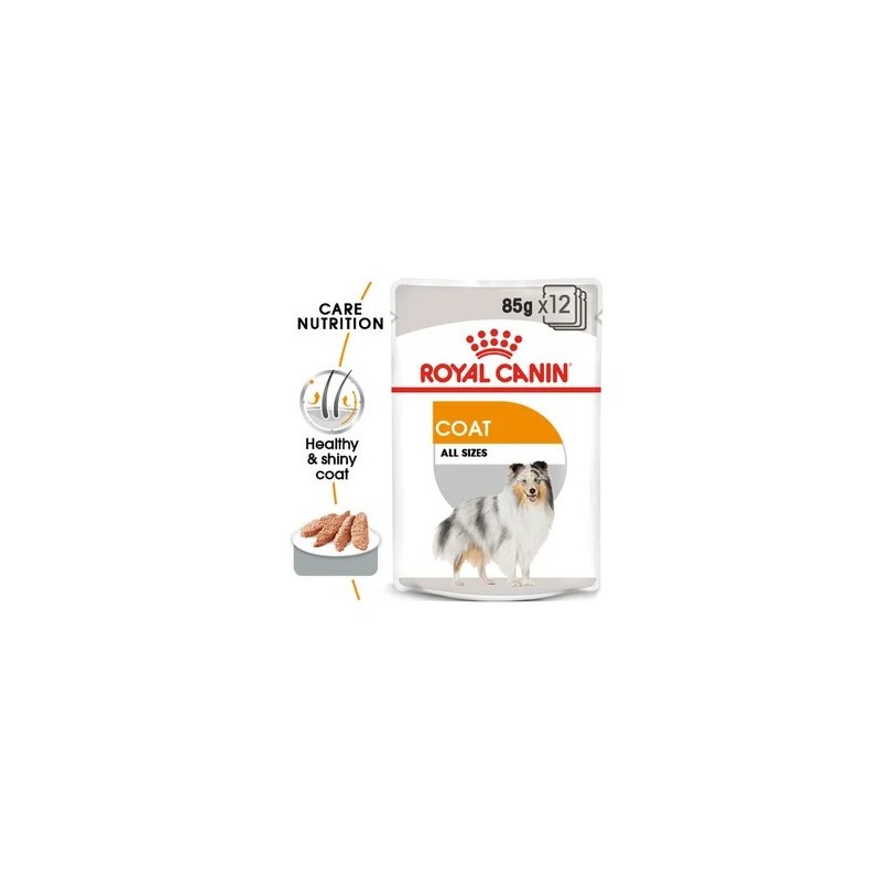 Your dogs coat and skin make up a large portion (approximately 12%) of their entire body weight. Thats why supporting good skin and coat health plays a part in supporting their overall health and wellbeing. ROYAL CANIN® Coat Care Loaf is exclusively formulated to support the health of your dogs skin and coat, while also providing your dog with a nutritionally balanced diet that supports their general health and wellbeing. Enriched with Omega-3 and Omega-6 fatty acids, this tailor-made product helps to nourish your dogs skin, as well as their coat. Whats more, this formula is also high in borage oil, known to benefit skin health. A nutrient called tyrosine is also included in this food. This nutrient helps to enrich the darker tones of your dogs coat, making it shinier and even more beautiful than it was before. Other ways in which you can support the health of your dogs skin and coat includes grooming your dog on a regular basis. This involves shampooing, brushing, and clipping their fur. Its also advisable to keep an eye on your dogs skin, regularly checking for any soreness or dryness. If you have any questions or concerns about the condition of your dogs skin or coat, please contact your veterinarian. This wet food comes in multipacks of 85g pouches. To cater to each dogs individual preferences, ROYAL CANIN® Coat Care is also available as dry food with crunchy kibble. If you usually feed your dog a mix of wet and dry food, we recommend that you check the on-pack feeding guidelines first to make sure your dog gets an ideal amount of each. At ROYAL CANIN®, everything we do is driven by our passion for pet health. Our Canine Care Nutrition range is the result of decades of advanced scientific research into developing tasty canine nutrition that supports your dogs overall health.
