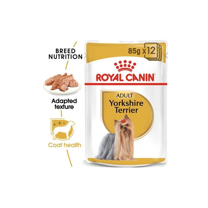 Complete feed for dogs - Specially for adult and mature Yorkshire Terriers - Over 10 months old (loaf). This product is available in 12 x 85g pouches.