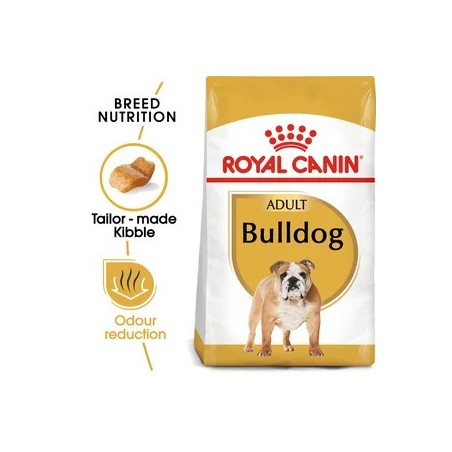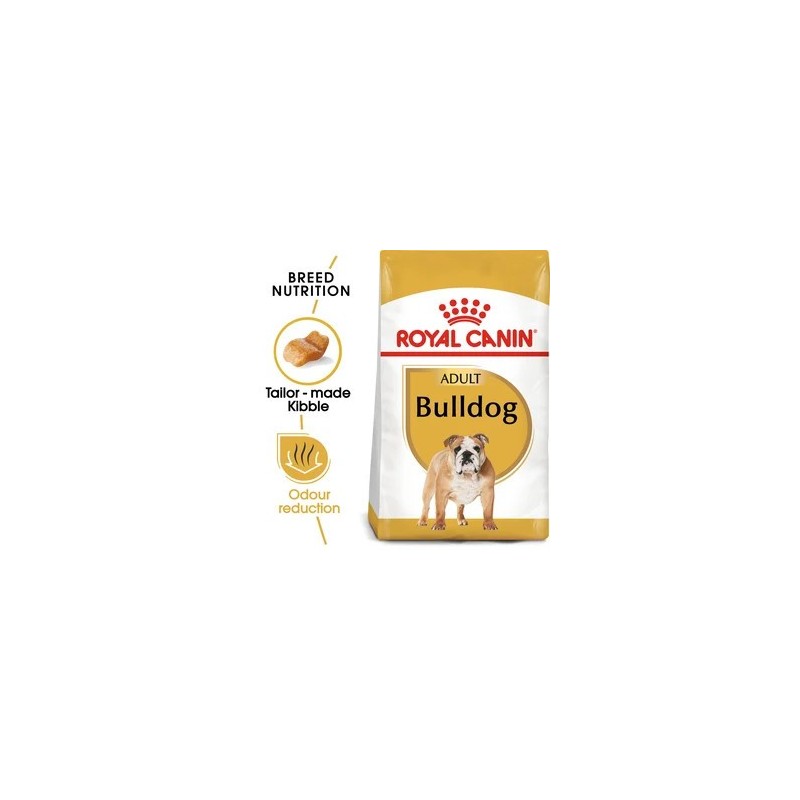 Because all breeds have their own unique needs, your adult Bulldog needs a complete and balanced diet containing nutrients that specifically help to support optimal health. Suitable for dogs over 12 months old, ROYAL CANIN® Bulldog Adult is specially formulated with the nutritional needs of your adult Bulldog in mind. ROYAL CANIN® Bulldog Adult helps to maintain a healthy balance of intestinal flora. This not only contributes to the general health of your dogs digestive system, but also helps to reduce the odour of your dogs stools. This exclusive formula also helps to support the skins barrier role. Because ROYAL CANIN® Bulldog Adults specific combination of nutrients helps to maintain skin health, this has a positive effect on your dogs coat health too. Bulldogs arent necessarily as active as some of the other dog breeds, so they dont have particularly high energy levels. ROYAL CANIN® Bulldog Adult helps provide controlled energy intake through a moderate energy content. ROYAL CANIN® Bulldog Adult is enriched with Omega-3 fatty acids known as EPA and DHA. These nutrients help to support the good health of your Bulldogs bones and joints. Whats more, this specially adapted formula also helps your dog maintain an ideal weight. The kibble in ROYAL CANIN® Bulldog Adult is tailor-made exclusively for the Bulldog breed. Because this breed has a turned up nose and an upper jaw thats shorter than the lower one, the size and shape of the kibble has been specially adapted to make it easy for your dog to pick up. Additionally, its texture encourages thorough chewing to deter your Bulldog from swallowing it too hastily. At ROYAL CANIN® were committed to providing nutritional solutions to your pets needs. All of our products undergo an extensive quality control process in order to guarantee the optimum quality of food as well as catering to your dogs specific dietary requirements and lifestyle. This means that when your dog eats ROYAL CANIN® Bulldog Adult, its getting a complete and balanced diet.
