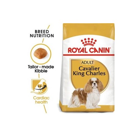 Cavalier King Charles Spaniels are happy and intelligent dogs that catch the eye with their distinctive domed head and large ears. Typically reserved, the Cavalier King Charles Spaniel breed is very gentle and affectionate. Because each breed has different needs, its important to ensure that your dogs diet contains nutrients that will support optimal health. Suitable for dogs over 10 months old, ROYAL CANIN® Cavalier King Charles Spaniel Adult is specially formulated with all the nutritional needs of your adult dog in mind. ROYAL CANIN® Cavalier King Charles Adult contains nutrients that help support healthy cardiac function such as an adapted content of minerals, EPA & DHA, taurine, L-Carnitine and antioxidants. For an ideal body weight, the Cavalier King Charles Spaniel breed should benefit from plenty of exercise and careful management of its daily intake of food. The combination of these 2 factors is key. ROYAL CANIN® Cavalier King Charles Spaniel Adult is specifically designed with precise levels of nutrients to help your dog maintain an optimum weight. Beneath the long, soft and silky coat lies a skin which is sensitive, meaning it needs to be sufficiently cared for. ROYAL CANIN® Cavalier King Charles Spaniel Adult helps provide nutrients that support a healthy skin and coat. These nutrients include a rich source of Omega-3 fatty acids EPA & DHA, as well as borage oil. The Cavalier King Charles Spaniel is a moderately brachycephalic breed meaning a kibble adapted to their facial type will enable them to chew and crunch it effectively. Thats why ROYAL CANIN® Cavalier King Charles Spaniel Adult contains kibble thats exclusively designed to make it easier for your Cavalier King Charles Spaniel to pick up while the palatability of the kibble will encourage your dog to readily chew and consume. At ROYAL CANIN® were committed to providing nutritional solutions to your pets needs. All of our products undergo an extensive quality control process in order to guarantee the optimum quality of food as well as catering to your dogs specific dietary requirements and lifestyle. This means that when your dog eats ROYAL CANIN® Cavalier King Charles Spaniel Adult, its getting a complete and balanced diet.