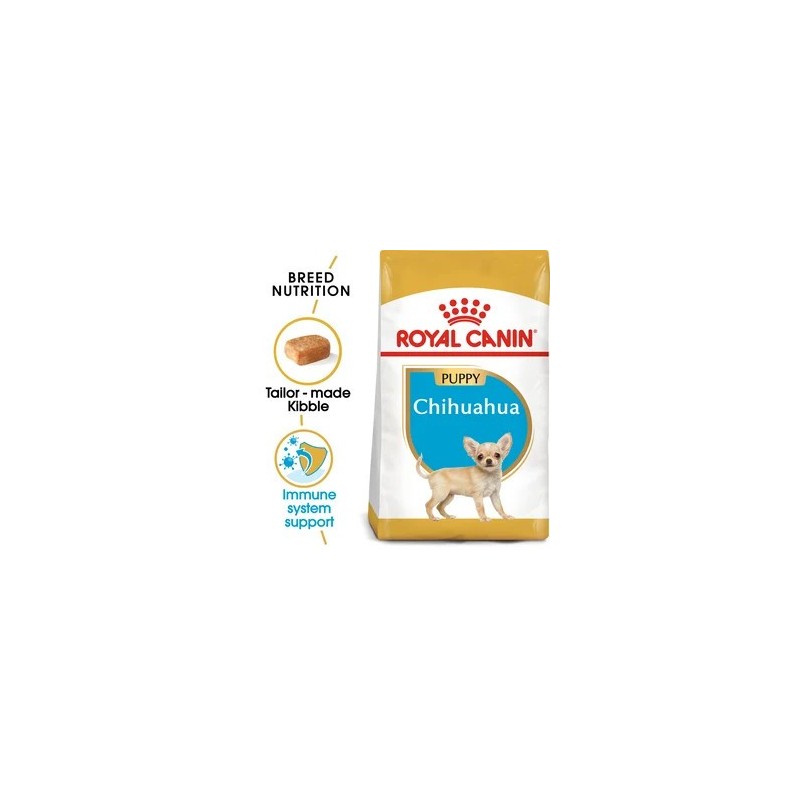 Although the Chihuahua is the worlds smallest breed of dog, they tend to have a hyperactive temperament and high energy levels which means their diet ideally needs a high enough protein and energy content to help replace the energy that your lively little dog expends. Suitable for Chihuahuas up to 8 months old, ROYAL CANIN® Chihuahua Puppy is specially formulated with all the nutritional needs of your young dog in mind. Growth is an essential stage in your puppys life its the time of important physical changes and new discoveries. During this key period, your puppys immune system is developing gradually. ROYAL CANIN® Chihuahua Puppy contains a complex of antioxidants (including vitamin E) that helps to support your puppys natural defences while theyre still developing. The exclusive, tailor-made kibble in ROYAL CANIN® Chihuahua Puppy is specially adapted to the Chihuahua puppys very small jaw making it easy for your puppy to pick up and chew. Additionally, the adapted kibble size and shape, as well as the exclusive formulation and selected flavours, all contribute to the high palatability level of this food meaning it satisfies the appetite of even the fussiest of Chihuahuas! Whats more, ROYAL CANIN® Chihuahua Puppys formula contains a variety of beneficial nutrients that help to support and maintain your puppys digestive health. These carefully balanced nutrients not only help to reduce the volume of your dogs faecal matter, but also the smell of it! At ROYAL CANIN® were committed to providing nutritional solutions to your pets needs. All of our products undergo an extensive quality control process in order to guarantee the optimum quality of food as well as catering to your puppys specific dietary requirements and lifestyle. This means that when your puppy eats ROYAL CANIN® Chihuahua Puppy, its getting a complete and balanced diet.