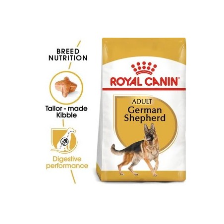 The German Shepherd is a highly active, intelligent breed. Because each breed has its own unique requirements, the food that you choose for your dog is important. Suitable for German Shepherds aged 15 months old and over, ROYAL CANIN® German Shepherd Adult is specially formulated with all the nutritional needs of your adult dog in mind. ROYAL CANIN® German Shepherd Adult contributes to supporting optimal digestive health. This is thanks to the inclusion of highly digestible L.I.P. proteins and a selection of specific fibres that limit intestinal fermentation and simultaneously help to maintain a good balance of intestinal flora. ROYAL CANIN® German Shepherd Adult helps to support the skins barrier role with a specific complex. It also contains the omega-3 fatty acids EPA & DHA. These fatty acids help to nourish and support your dogs healthy skin and coat. The German Shepherd is known for its lively temperament and high level of activity participation. This means a diet containing nutrients that support joint health can help maintain this breeds high activity levels. This is the reason that ROYAL CANIN® German Shepherd Adult is enriched with specific nutrients to help support healthy bones and joints. Whats more, this formula also contributes to the maintenance of a healthy weight. Furthermore, the exclusive kibble in ROYAL CANIN® German Shepherd Adult has a unique size and shape that is specially adapted to the German Shepherds unique jaw. This tailor-made kibble is designed specifically to encourage dogs to chew it properly while eating. This tailor-made kibble is designed specifically for this breed to enhance the palatability of this formula. At ROYAL CANIN® were committed to providing nutritional solutions to your pets needs. All of our products undergo an extensive quality control process in order to guarantee the optimum quality of food as well as catering to your dogs specific dietary requirements and lifestyle. This means that when your dog eats ROYAL CANIN® German Shepherd Adult, its getting a complete and balanced diet.