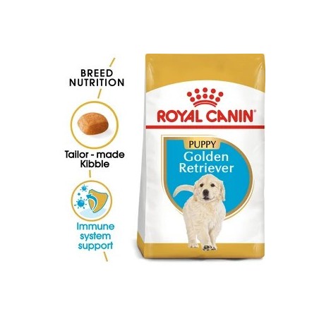 For your young Golden Retriever, growth is a very important stage of life. Its the time of new discoveries and significant physical changes. Thats why your puppy can benefit from specific nutrients that have been tailored to support optimal health during this key period. Suitable for puppies up to 15 months old, ROYAL CANIN® Golden Retriever Puppy is specially formulated with all the nutritional needs of your young Golden Retriever in mind. During this growth phase, your puppys immune system develops gradually thats why ROYAL CANIN® Golden Retriever Puppy contains a complex of antioxidants (including vitamin E) to help support your puppys natural defences and maintain optimal health as it grows. ROYAL CANIN® Golden Retriever Puppys exclusive complex also helps to maintain the health of your young retrievers skin and coat. Enriched with Omega-3 fatty acids EPA, DHA and borage oil, this formula helps support the skins barrier role. The health of your puppys skin has an impact on the health of its coat thats why its important to ensure that your dog gets the nutrients it needs to nourish and soothe its skin. To support your dogs digestive health, ROYAL CANIN® Golden Retriever Puppy contains a combination of nutrients with high quality protein and prebiotics. High quality protein (L.I.P.) is selected specifically for its high digestibility. This formula also helps to maintain a healthy balance of internal flora which ultimately contributes to good stool quality. At ROYAL CANIN® were committed to providing nutritional solutions to your pets needs. All of our products undergo an extensive quality control process in order to guarantee the optimum quality of food as well as catering to your puppys specific dietary requirements and lifestyle. This means that when your puppy eats ROYAL CANIN® Golden Retriever Puppy, its getting a complete and balanced diet.