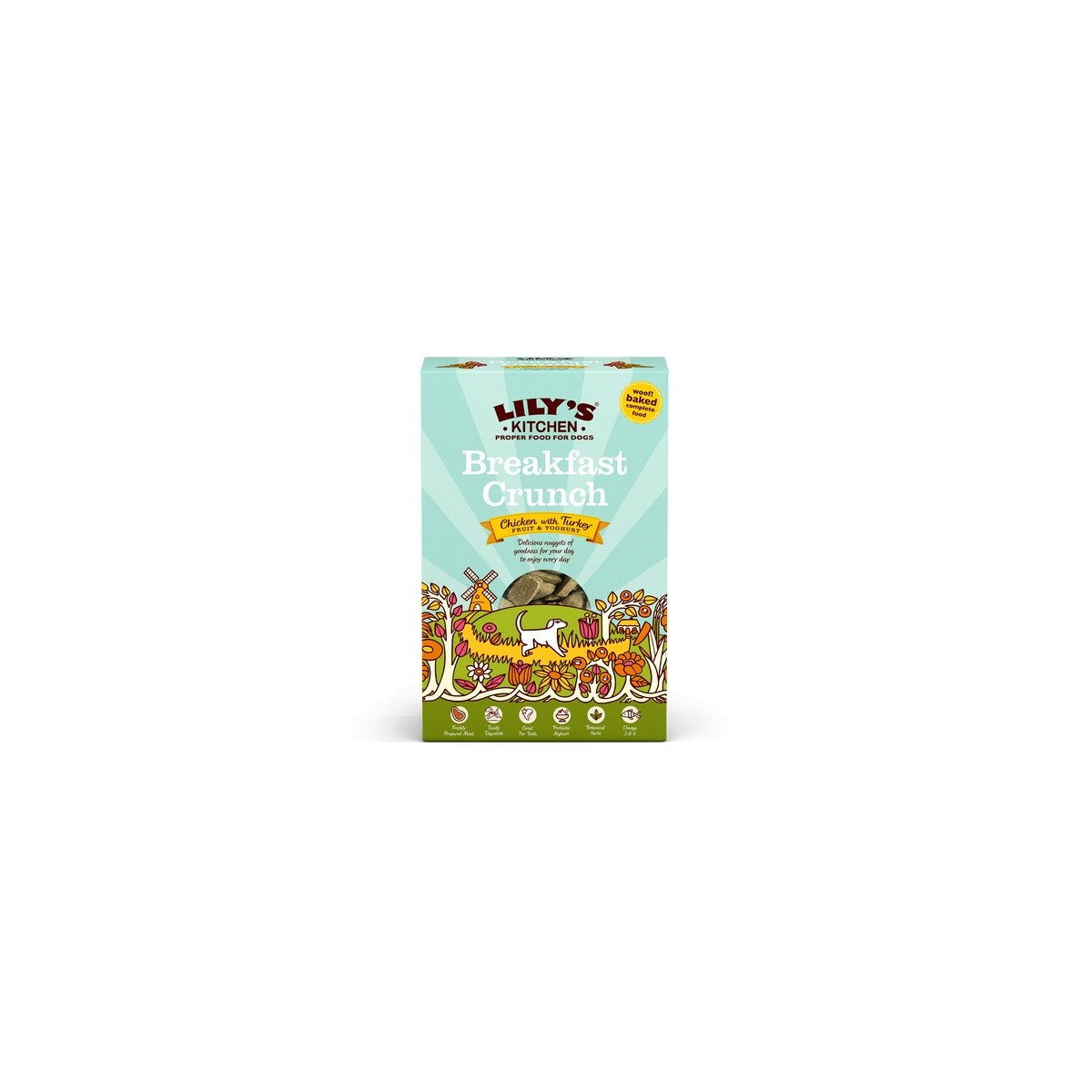 Our baked Breakfast Crunch is the perfect way to start your dogs day! These toasted nuggets of deliciousness are made with lots of freshly prepared turkey meat, with chicken livers, yoghurt, berries, bananas, sunflower seeds and oats. We add botanical herbs like rosehips and marigold petals for your dogs holistic health and a splash of clear pressed salmon oil to put a spring in their step and help keep the sparkle in their coat. Each mini nugget is slowly oven baked until golden and crunchy, so our recipe is gentle on your dogs tum and good for their teeth. We make this complete recipe with wholesome, naturally nutritious ingredients - freshly prepared meat, vegetables, fruits and herbs - to produce a delicious, digestible food for dogs. We only ever use proper meat in our recipes: no meat meal, no bone meal, no rendered meat. Our unique recipes dont contain any cheap fillers - like wheat, corn or soya - and they dont contain any nasties.,Chicken (26%); Turkey (4%) Oats; Rice; Potato protein; Chicken liver gravy; Vitamins & minerals; Chicken fat; Fresh apples; Sunflower seeds; Eggshells; Flax seed; Nutritional yeast; Clear salmon oil; Probiotic yoghurt; Bananas; Cranberries; Whey powder Herbs & botanicals: Alfalfa, Rosehips, Chickweed, Cleavers, Golden Rod, Nettles, Kelp, Celery Seeds, Milk Thistle, Dandelion Root, Burdock Root, Marigold Petals.