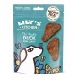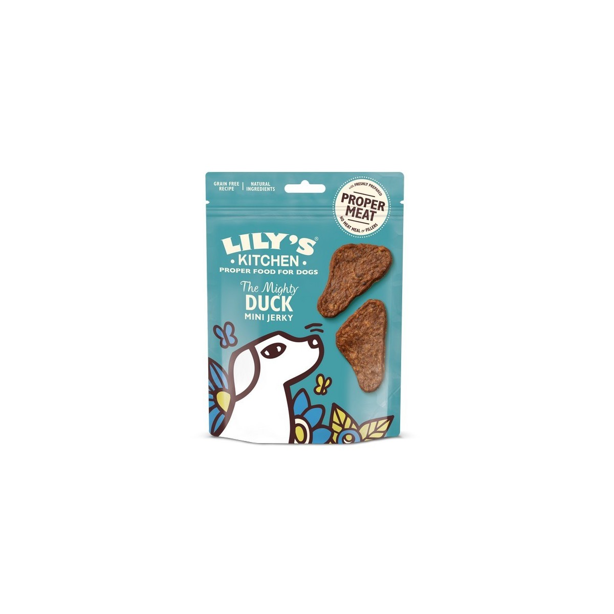 Mighty in taste and packed full of lip-lickingly delicious, proper meat, your dog will be over the moon with our mini jerky! Made with freshly prepared duck and gently oven baked for a lovely, chewy, flexible texture, this mini jerky is full of valuable protein and makes a simply delicious, natural treat. Perfect for training, in between meals or just because. These tempting treats are made to a grain free recipe, with natural ingredients and without any added nasties - so your furry family can enjoy them every day. Mix and match our pocket-size bags to find your dogs perfect treat-time. Feeding guidelines: These treats are suitable for dogs from 4 months old. Up to 5 a day. Always make sure theres a bowl of fresh water available. We like to keep our four-legged friends fit and healthy so its best not to feed them too many treats. Always supervise your dog when theyre eating a treat. (Excited dogs can sometimes forget to chew!),Freshly Prepared Duck (80%), Pea Protein, Vegetable Glycerine (derived from rapeseed oil), Distilled White Vinegar. Technological Additives: Antioxidants (Tocopherol Extracts from Vegetable Oils).