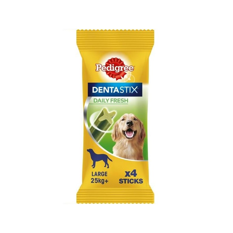 PEDIGREE® Dentastix® Fresh has a unique X shape and, when fed daily, the combination of its special texture and active ingredients, is scientifically proven to help reduce tartar build-up by up to 80%. It also contains a unique active ingredient blend of Green Tea Extract and patented Eucalyptus Oil, which are proven to help freshen breath. PEDIGREE® Dentastix Fresh - great tasting every day care. Letting your dog get on with what's really important - being a dog!,Composition: cereals, derivatives of vegetable origin (including 0.2% decaffeinated green tea extract and 0.06% eucalyptus oil), meat and animal derivatives, minerals (including 2.4% sodium tripolyphosphate), vegetable protein extracts. Analytical consituents (%): protein: 8.4 / fat content: 1.2/inorganic matter: 5.4/ crude fibres: 2.8 energy: 300 kcal/100g. Additives per kg: Colourants/Nutritional additives: Zinc sulphate heptahydrate: 1045 mg, Sensory additives: Chicken flavour: 572mg.