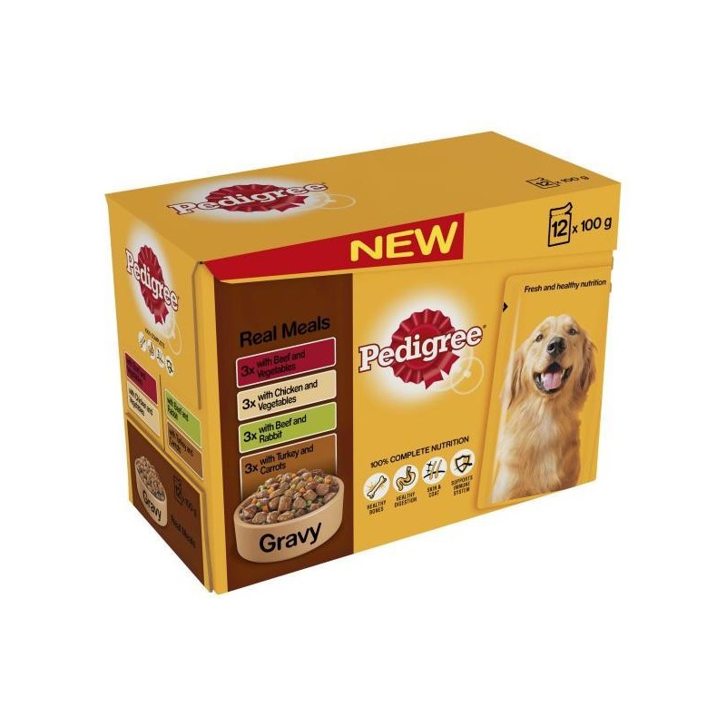 Pedigree Pouch Real Meals Gently cooked to retain more natural vitamins, without artificial colourings or preservatives. Each pouch is specially formulated for the needs of your adult dog to help keep him in peak condition every day, including; ? Special Oils for healthy skin and coat ? Selected natural fibres for gut health ? Vitamin E and minerals for natural defences More convenience: to release all the goodness, simply unzip the easy-to-open pouch and serve immediately: no mess, no can openers or serving spoons required.
