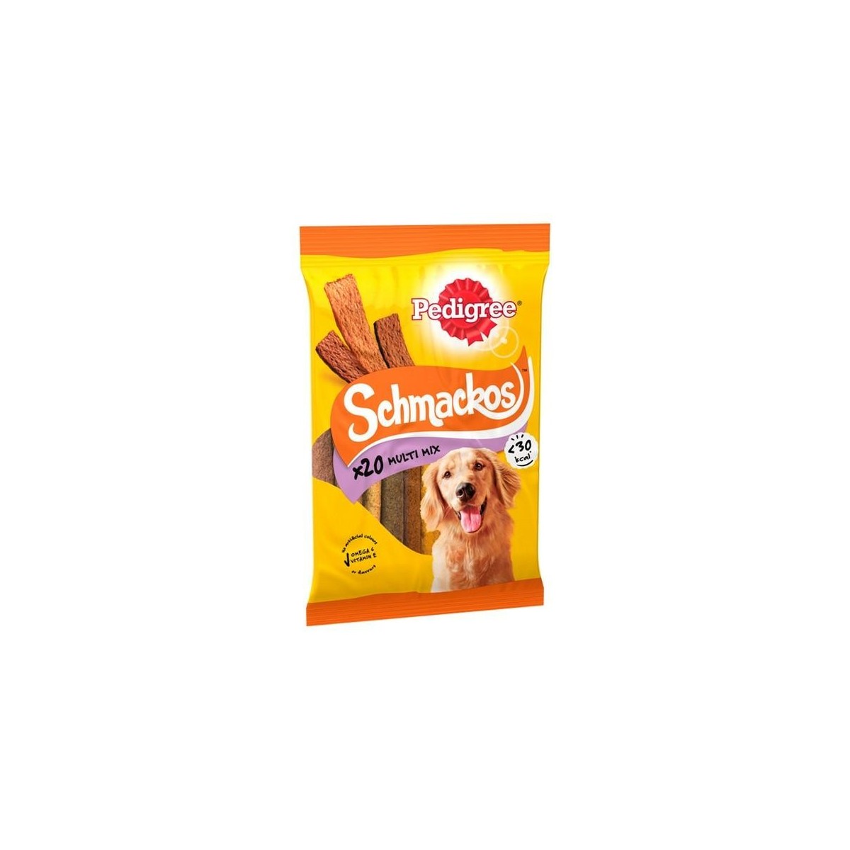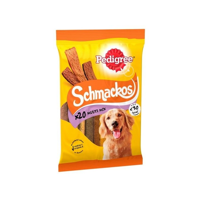 Complementary pet food for adult dogs. Delicious Tender Strips - PEDIGREE® SCHMACKOS™ treats for dogs are soft, succulent treats, full of delicious flavours that dogs adore. 20 tasty dog treat strips in meat variety flavours