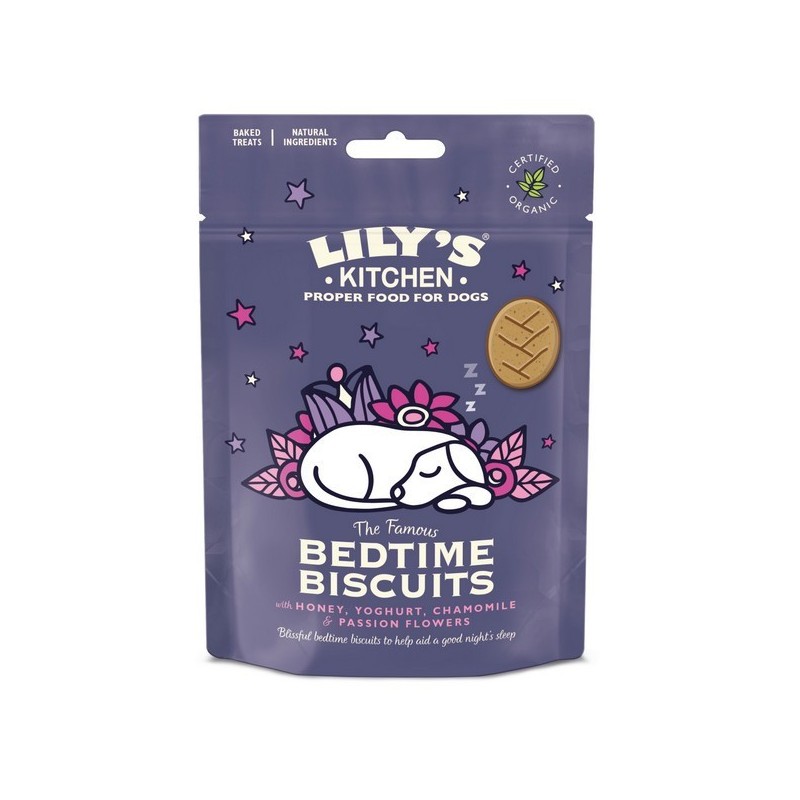 A delicious biscuit to give to your dog before bed to help with a blissful nights sleep. These tasty, crunchy biscuits are traditionally oven baked and made with the finest organic ingredients. Weve added honey to help support the immune system as well as yoghurt to provide a source of good bacteria for gut health. Youll also find chamomile, known for its calming properties, to help soothe for bedtime. Sweet dreams, pup.,Composition: Organic Light Rye Flour, Organic Oat Flour, Organic Oats, Organic Yoghurt (5%), Organic Sunflower Oil, Nutritional Yeast, Organic Honey (4%), Organic Chamomile (1%), Organic Passion Flower (1%).