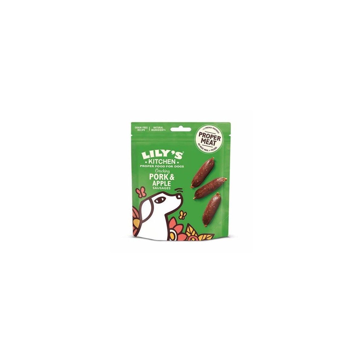 A cracking bag of succulent little sausages packed with irresistible, proper meat, you'll get more waggs than ever before! Made with freshly prepared pork and air-dried for a satisfyingly chewy texture, these delightful snack-size sausages are full of valuable protein for a simply delicious, natural treat. Perfect for training, in between meals or just because. These tempting treats are made to a grain free recipe, with natural ingredients and without any added nasties - so your furry family can enjoy them every day. Mix and match our pocket-size bags to find your dogs perfect treat-time. Feeding guidelines: These treats are suitable for dogs from 4 months old. Up to 3 a day. Always make sure theres a bowl of fresh water available. We like to keep our four-legged friends fit and healthy so its best not to feed them too many treats. Always supervise your dog when theyre eating a treat. (Excited dogs can sometimes forget to chew!),Freshly Prepared Pork (74%), Pea Protein, Vegetable Glycerine (Derived from Rapeseed Oil), Apple (4%). Additives: Technological Additives: Antioxidants (Tocopherol extracts from Vegetable Oil).