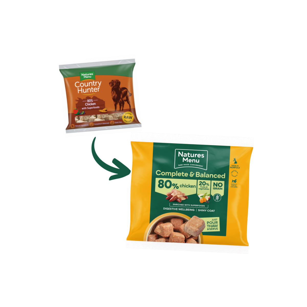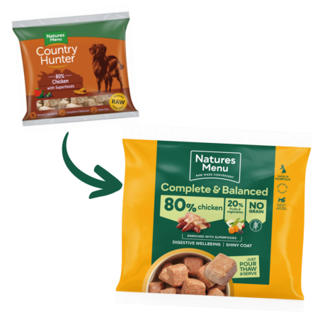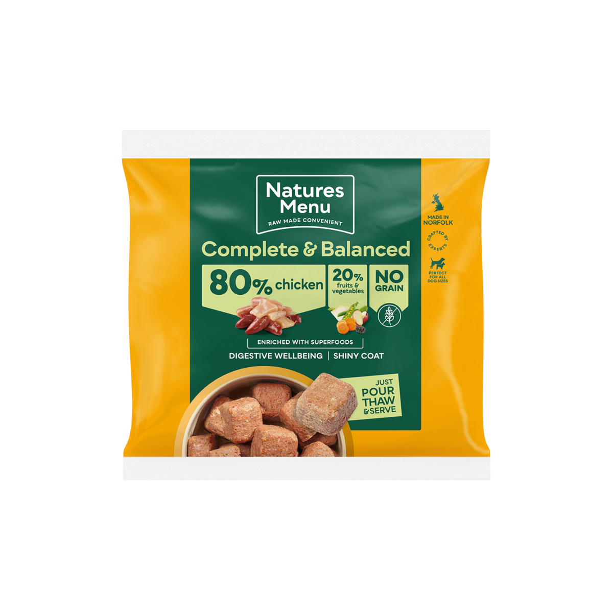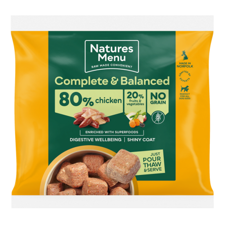 Delicious single protein chicken nuggets for dogs. Made with 80% quality chicken, boosted with a variety of powerful superfoods and nutritious vegetables. Grain free. Pack size 1kg.