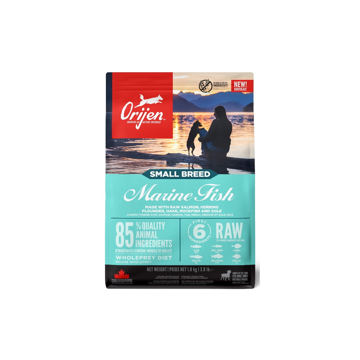 Dogs are ancestral carnivores, so they need a Biologically Appropriate diet rich and varied in whole animal ingredients. ORIJEN Small Breed Marine Fish helps support unique health benefits that help small breed dogs thrive. Packed with 85% quality animal ingredients like raw salmon and herring. With Whole Prey animal ingredients like organs and bone, ORIJEN food is made with the most nutrient-dense, succulent parts of the prey to deliver the nutrition dogs need. The result is a diet for your canine companion that is beyond comparison. The first 6 ingredients are raw salmon, herring, flounder, hake, rockfish and sole - raw ingredients are frozen at their peak freshness 85% quality fish ingredients, providing a strong source of essential protein, vitamins and minerals Authentic Whole Prey diet, using the nutritious parts of the prey. Including meat, organs and bone No grain or poultry ingredients (Produced in a facility that also processes grains and poultry.) Marine Fish is lower in fat to help maintain a healthy weight Loaded with omega 3 and omega 6 fatty acids to support the skin & coat health