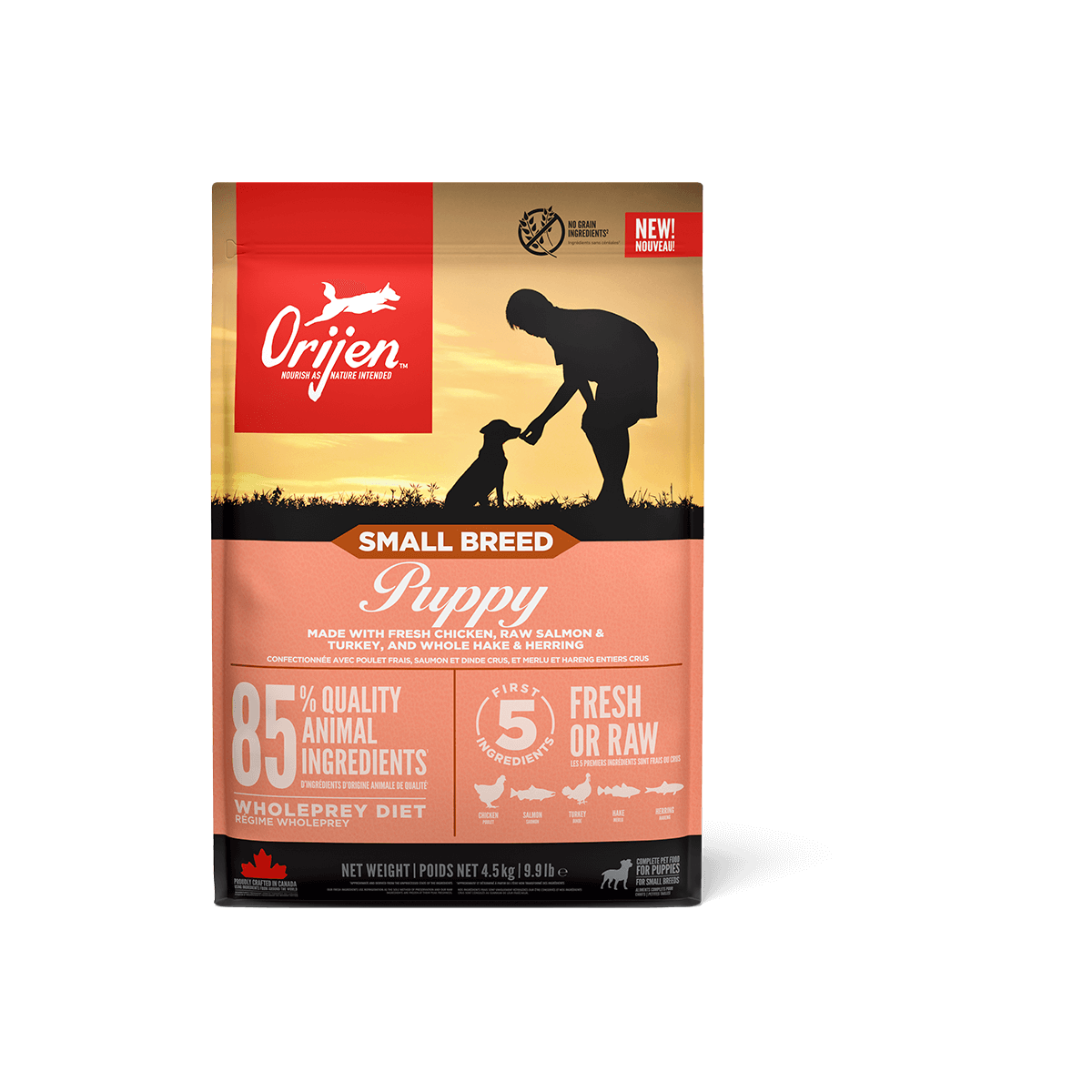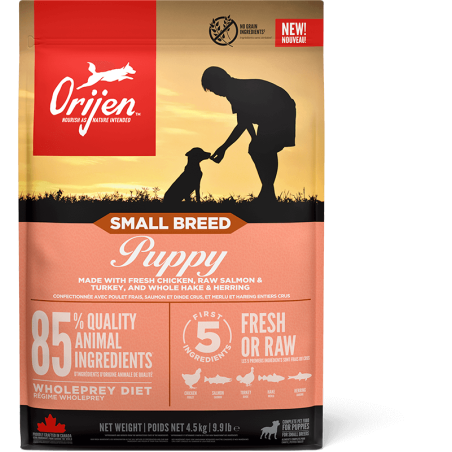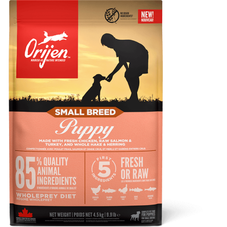All puppies do best on a Biologically Appropriate diet rich in protein and fat from quality animal ingredients to support their development. ORIJEN Small Breed Puppy diet is packed with 85% quality animal ingredients like fresh or raw chicken, salmon and turkey. Packed with Whole Prey animal ingredients like organs and bone, ORIJEN food is made with the most nutrient-dense, succulent parts of the prey to deliver the nutrition puppies need. The result is a diet for your canine companion that is beyond comparison. KEY BENEFITS: The first 5 ingredients are fresh or raw chicken, salmon, turkey hake and herring - fresh ingredients use refrigeration as the sole method of preservation and our raw ingredients are frozen at their peak freshness 85% quality poultry and fish ingredients, providing strong source of essential protein, vitamins and minerals Authentic Whole Prey diet, using the nutritious parts of their prey. Including meat, organs and bone Muscle development, balanced protein and minerals from animal ingredients to help support development of strong muscles and bones Freeze-dried coated for a burst of raw flavour your dog instinctively craves Antioxidants from cranberries, blueberries and botanicals help to support immune function