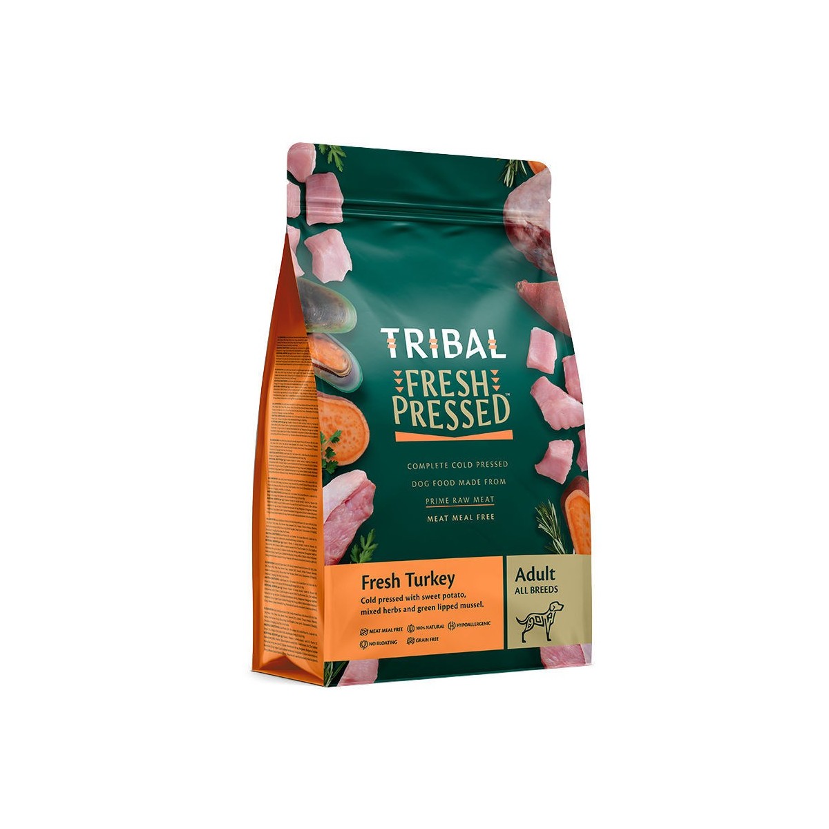 A grain free & natural cold-pressed complete dog food with fresh turkey, green lipped mussel and joint care, specially developed for adult dogs