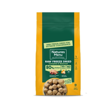 Raw, freeze-dried, Complete and Balanced – this highly convenient food is made with 80% raw chicken. Also enriched with 20% fruits, vegetables and superfoods, like pea fibre, blackberries and yucca. No need to thaw, simply pour and serve.