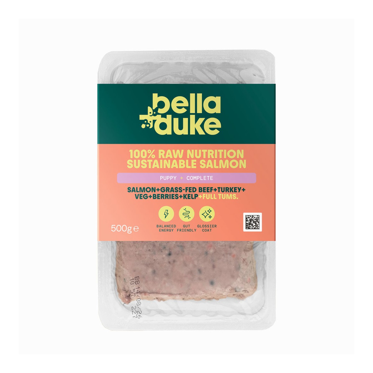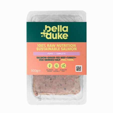 Sustainable Salmon (MSC) 40% (salmon meat 38%, salmon bone 2%), grass-fed beef 30% (beef tripe 17%, beef kidney 5%, beef liver 5%, beef trachea 3%), higher-welfare turkey 20% (turkey meat 19%, turkey bone 1%), sustainable seasonal vegetables 7% (carrots 1.4%, sprouts 1.4%, broccoli 1.4%, cauliflower 1.4%, cabbage 1.4%), blueberries 1%, sustainable hand harvested organic Scottish kelp 1%, psyllium husk 0.4%, pure olive oil 0.2%, dried algae (Schizochytrium sp.) 0.1%, beet pulp 0.04%, minerals 0.04%.