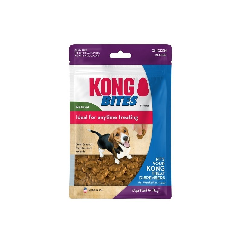 KONG Bites Chicken delights your dog with a premium, all-natural snack that is great for bite-sized, treatable moments. These tasty treats have chicken as a key ingredient and are ideally sized for packing in pockets and pouches. The chewy texture and irresistible taste give an immediate reward to dogs for any occasion. Made in the USA with a grain free formula, they also reward the health conscious.