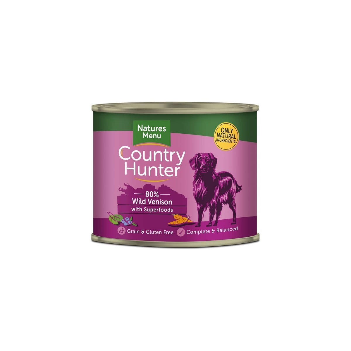 Tender cuts of wild venison with a tasty blend of superfood and wholesome fruits and vegetables. Complete and nutritionally balanced. Single protein. Grain free. Pack size 600g. Suitable for adult dogs and puppies over 20 weeks of age. The ultimate choice in real and natural pet food, Country Hunter offers only the very best for your dog. This seriously meaty, complete and balanced meal is made with 80% wild venison blended with fruit and vegetable superfoods, including peas, swede, apples and carrots. All gently cooked inside the can to lock in the goodness and flavour that your dog will love. We only ever use quality, human grade meats in our meals. No meat meals or meat derivatives, ever. And no artificial colours or preservatives either.,Pork 40%, Chicken 35%, Turkey 20%, Minerals