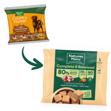 A tasty complete and nutritionally balanced raw meal of farm-reared turkey, with a delicious blend of sweet potato, carrots, peas and apples. We only ever use quality, human grade meats responsibly sourced from trusted suppliers. No meat meals or meat derivatives, ever. And no artificial colours or preservatives either. Naturally gentle on digestion, perfect for dogs with sensitivities and allergies. Country Hunter Nuggets are a great starter meal for those considering switching their dog to a raw diet. Simply count out the amount of nuggets needed, thaw and serve. All of our complete and balanced meals are veterinary approved and made to FEDIAF guidelines. Product may include small bone pieces (4g/100g). Suitable for adult dogs and puppies over 20 weeks of age. Due to this being a natural raw product, colour and appearance may vary between batches,Turkey 80%, Peas 5%, Sweet Potato 4%, Carrots 4%, Apples 4%, Spinach 1%, Yucca Extract, Green Tea Extract, Dicalcium Phosphate