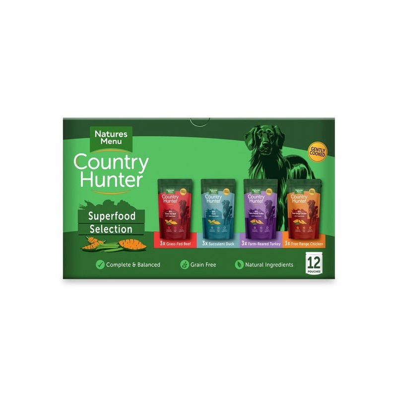 A scrumptious selection of our Country Hunter pouches for dogs. Made with 80% meat, plus our special blend of wholesome superfoods, vitamins and minerals. Complete and nutritionally balanced. Grain and gluten free. Pack size: 12 x 150g 12 pouches of delicious and juicy 80% meat Country Hunter Pouches. Each pack contains: 3 x Free Range Chicken 3 x Farm Reared Turkey 3 x Succulent Duck 3 x Grass Grazed Beef Our delicious Country Hunter pouches for dogs are filled with top quality ingredients, sealed and then gently cooked to lock in goodness. A great alternative to raw feeding when travelling or staying away. Suitable for adult dogs and puppies over 20 weeks. Each pouch contains a single source of protein, scrumptious fruit and vegetables plus essential vitamins and minerals. Grain and gluten free. We only ever use quality, human grade meats in our meals. No meat meals or meat derivatives, ever. And no artificial colours or preservatives either.,GRASS GRAZED BEEF COMPOSITION Beef 80%, Sweet Potato 3%, Carrots 3%, Green Beans 3%, Mixed Berries 2%, Spirulina 0.5%, Yucca Extract, Green Tea Extract, Rosemary Extract FREE RANGE CHICKEN COMPOSITION Free Range Chicken 80%, Sweet Potato 3%, Carrots 3%, Green Beans 3%, Mixed Berries 2%, Spirulina 0.5%, Yucca Extract, Green Tea Extract, Rosemary Extract SUCCULENT DUCK COMPOSITION Duck 80%, Sweet Potato 3%, Carrots 3%, Green Beans 3%, Mixed Berries 2%, Spirulina 0.5%, Yucca Extract, Green Tea Extract, Rosemary Extract FARM REARED TURKEY COMPOSITION Turkey 80%, Sweet Potato 3%, Carrots 3%, Green Beans 3%, Mixed Berries 2%, Spirulina 0.5%, Yucca Extract, Green Tea Extract, Rosemary Extract