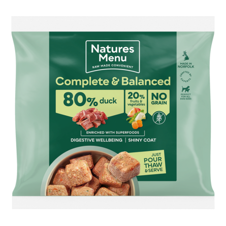 Complete and balanced meaty superfood nuggets made with succulent duck and a delicious blend of plum, peas and root vegetables. We only ever use quality, human grade meats in our raw meals. No meat meals or meat derivatives, ever. And no artificial colours or preservatives either. Naturally gentle on digestion, perfect for dogs with sensitivities and allergies. Country Hunter Nuggets are a great starter meal for those considering switching their dog to a raw diet. Simply count out the amount of nuggets needed, thaw and serve. All of our complete and balanced meals are made to FEDIAF guidelines. Product may contain small bone pieces (4g/100g). Suitable for adult dogs and puppies over 20 weeks of age. Due to this being a natural raw product, colour and appearance may vary between batches,Duck 80%, Peas 5%, Swede 4%, Carrots 4%, Plum 4%, Spinach 1%, Yucca Extract, Green Tea Extract, Dicalcium Phosphate