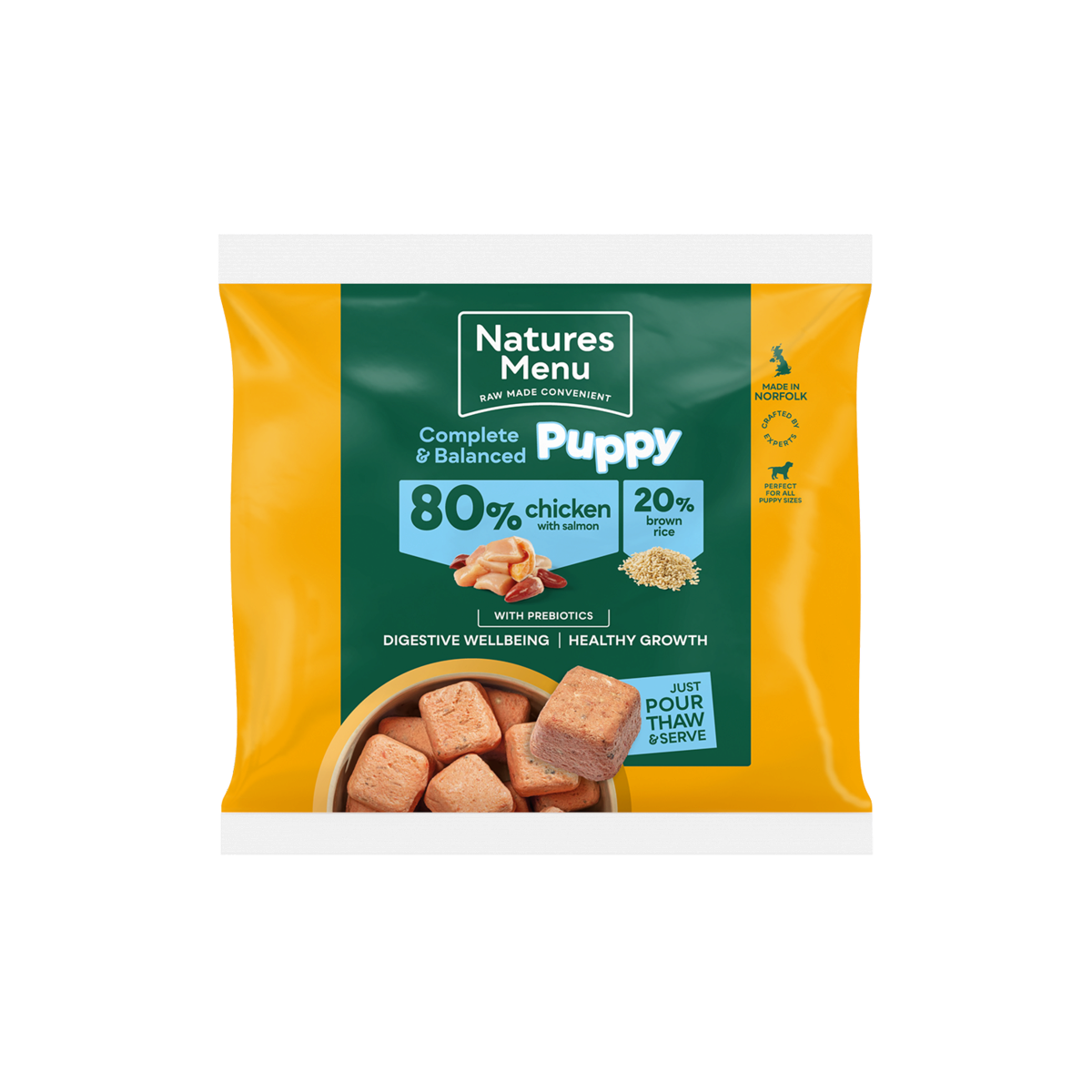 Made with chicken, salmon and chicken liver plus wholesome brown rice and an abundance of natural vitamins and minerals to give your growing puppy a nutritionally balanced meal they will love. Bone free and suitable from weaning onwards. Formulated with the support of our in house vets to provide daily nutrition for puppies in an easy to serve nugget. Easy to serve, raw ready meal. Simply count out the amount of nuggets needed, thaw and serve. We only use quality, human grade meats in our raw meals, and absolutely no meat meals or meat derivatives. All of our complete and balanced meals are veterinary approved and made to FEDIAF guidelines. Due to this being a natural raw product, colour and appearance may vary between batches,Chicken 65%, Rice 18%, Salmon 10%, Chicken Liver 5%, Yucca Extract, Green Tea Extract, Dicalcium Phosphate