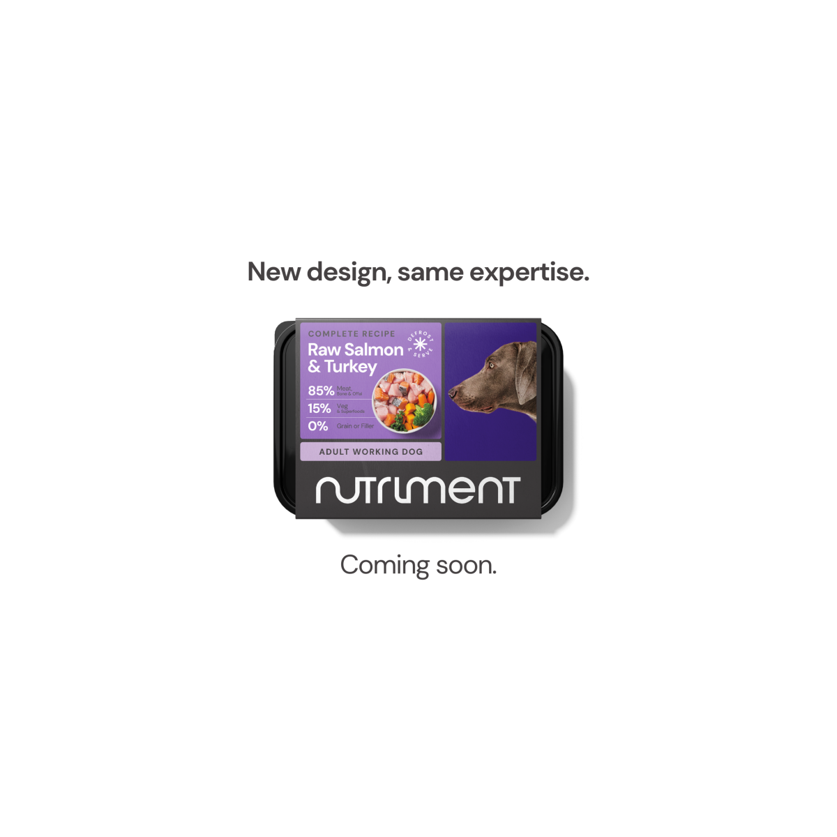 Our raw salmon and turkey dog food is sold in 500g trays or 1.4kg chubbs. Feed 2-3% of the dog's ideal body weight per day, ideally spread over two meals.